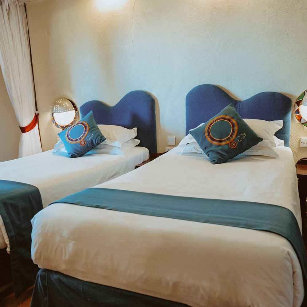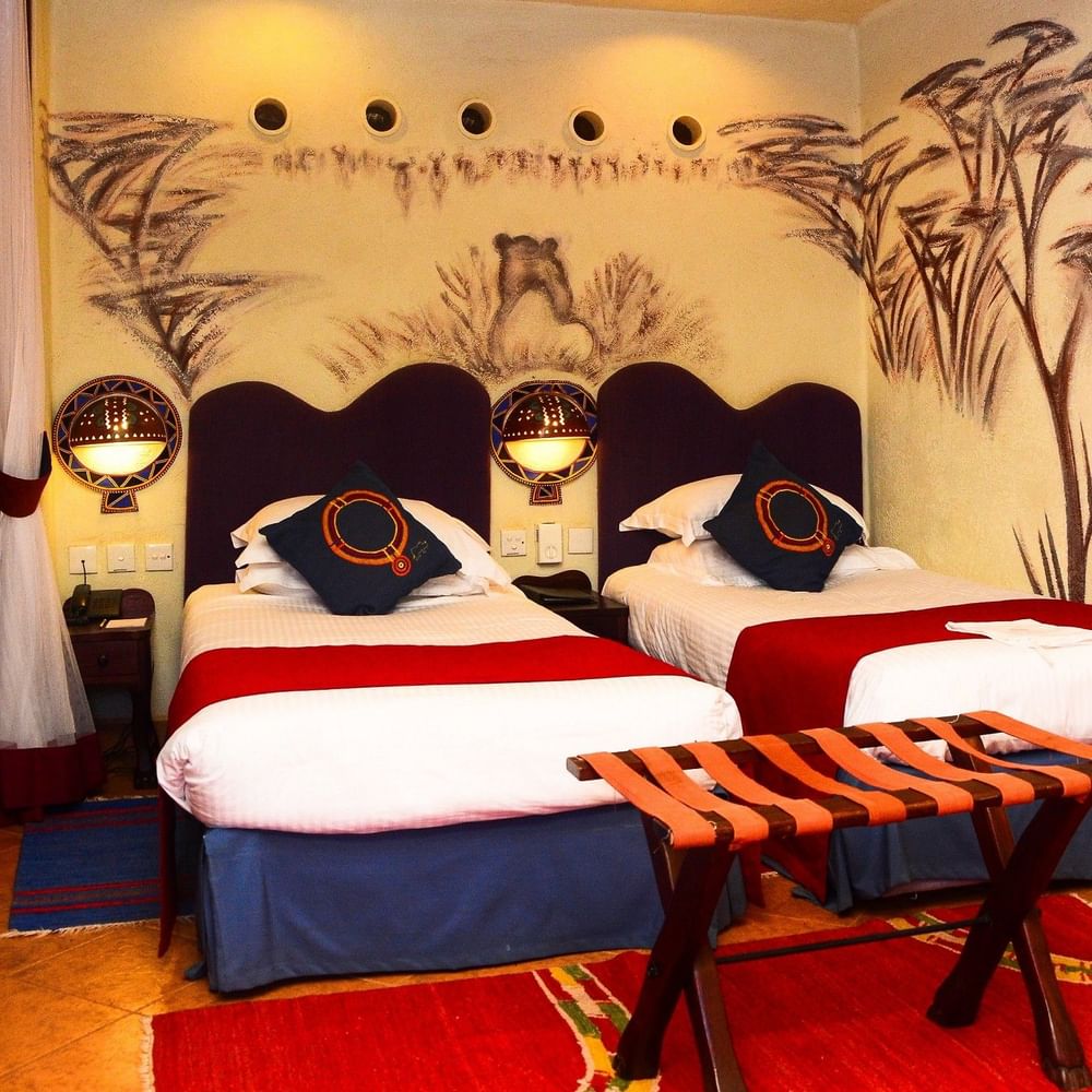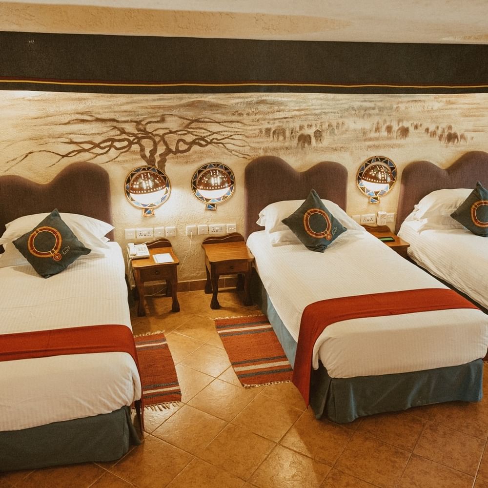 Infused with Maasai-inspired décor, this room features twin beds and a private balcony overlooking Amboseli’s sweeping plains. Traditional artifacts, hand-painted murals, and warm tones create a cosy and culturally rich retreat.