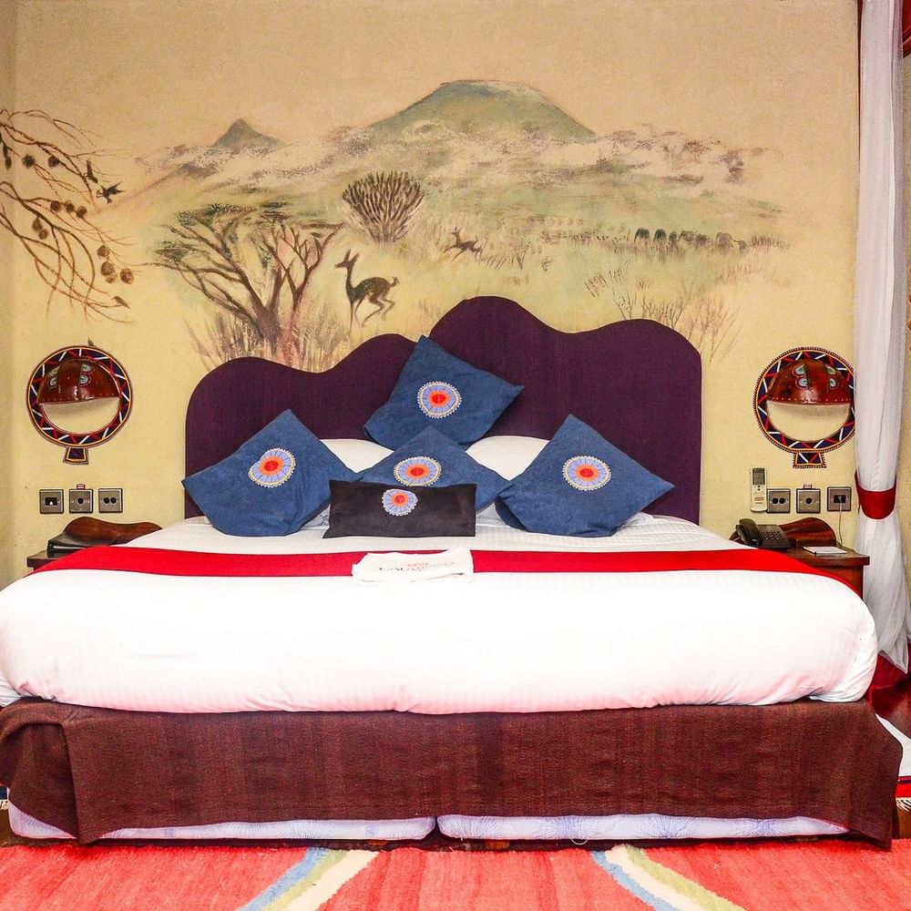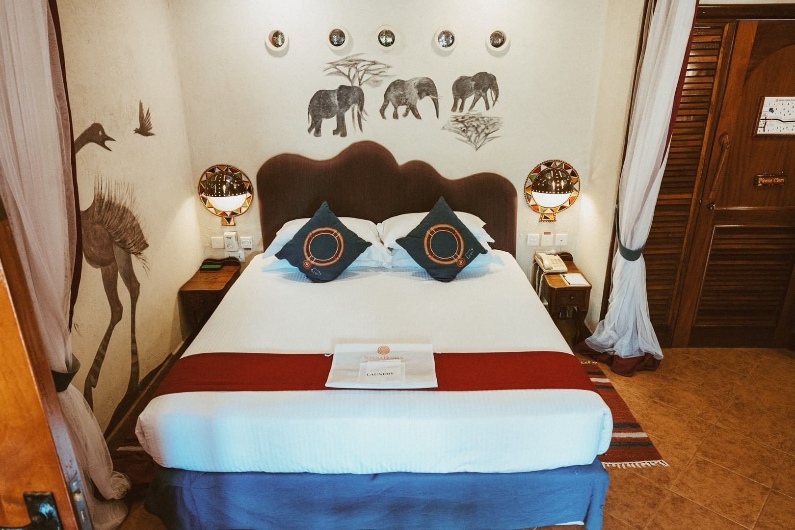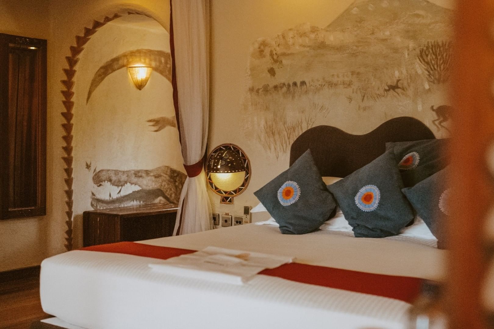 The room is adorned with hand-painted wildlife murals and locally crafted artefacts, echoing the spirit of the Maasai. Ideal for couples or solo travellers seeking a serene retreat in the wild.
