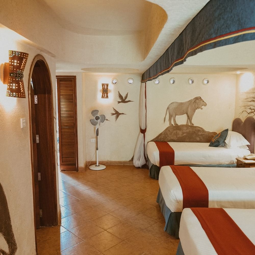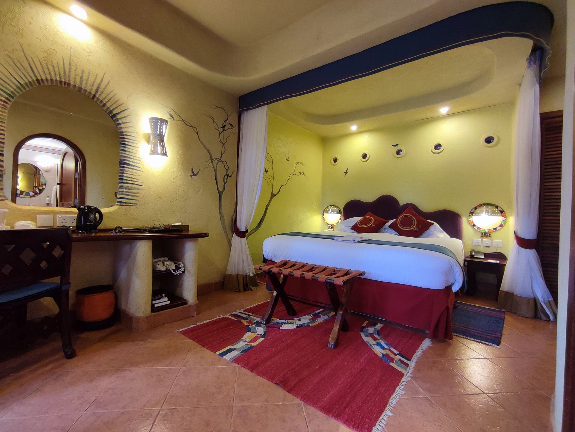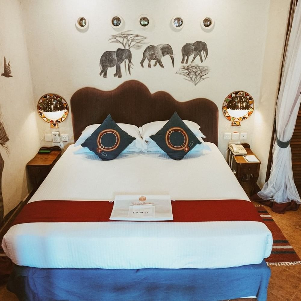 The room is adorned with hand-painted wildlife murals and locally crafted artefacts, echoing the spirit of the Maasai. Ideal for couples or solo travellers seeking a serene retreat in the wild.