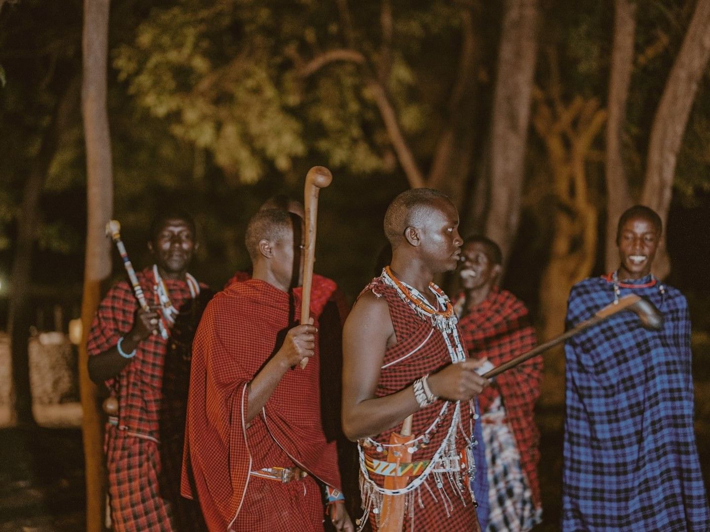 Nothing captures the spirit of safari quite like a bush dinner under the stars. Set in a lantern-lit acacia grove near the lodge, the evening begins with cocktails by the campfire. Enjoy a six-course BBQ feast paired with fresh salads and sides, as scarlet-clad Maasai warriors perform traditional songs and dances.