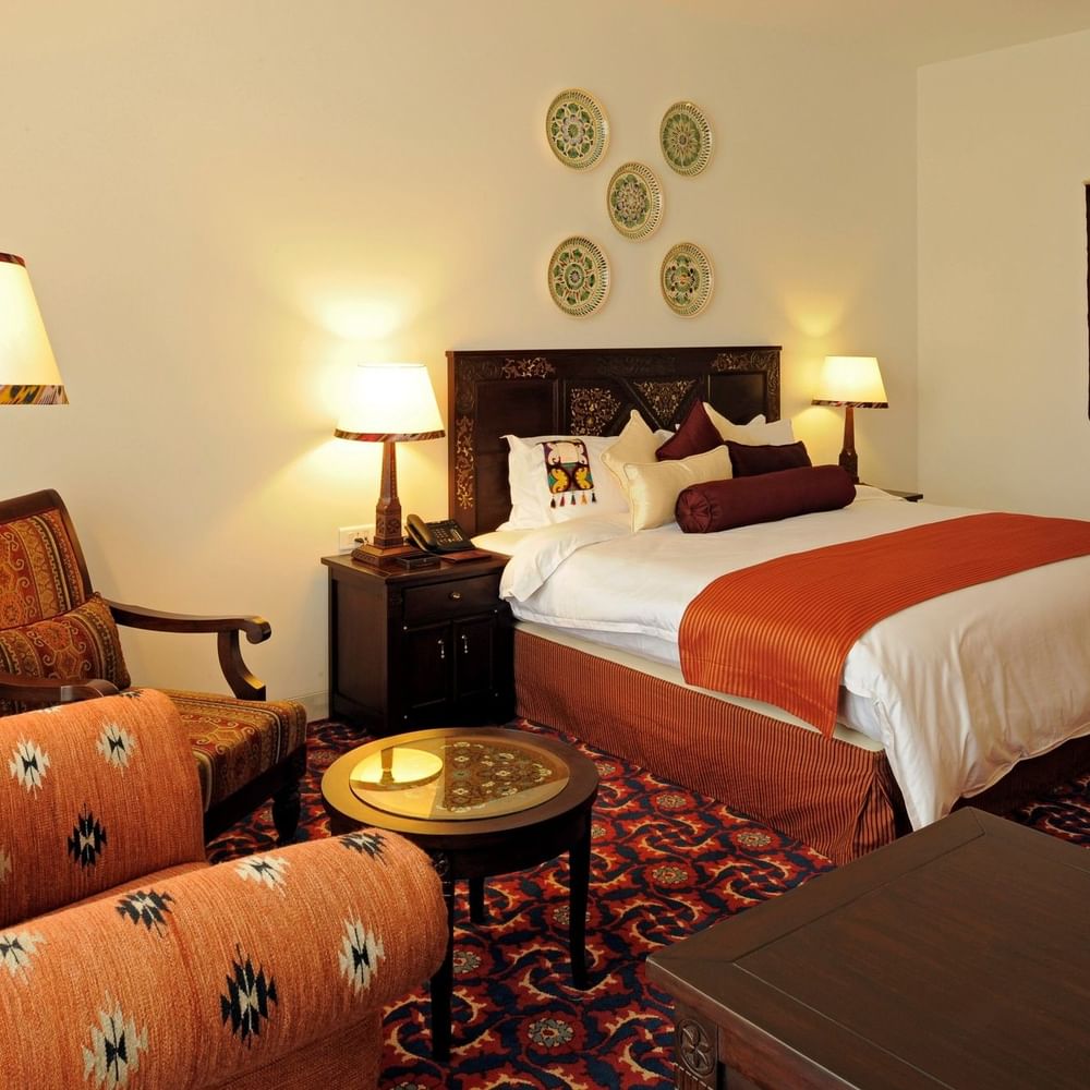 Every room reveals its own distinctive character, enriched with intricately patterned fabrics, bespoke artwork, and custom hand-carved wooden furnishings. The interiors beautifully balance heritage and modern sophistication, creating warm and inviting spaces where guests can relax in comfort and style.