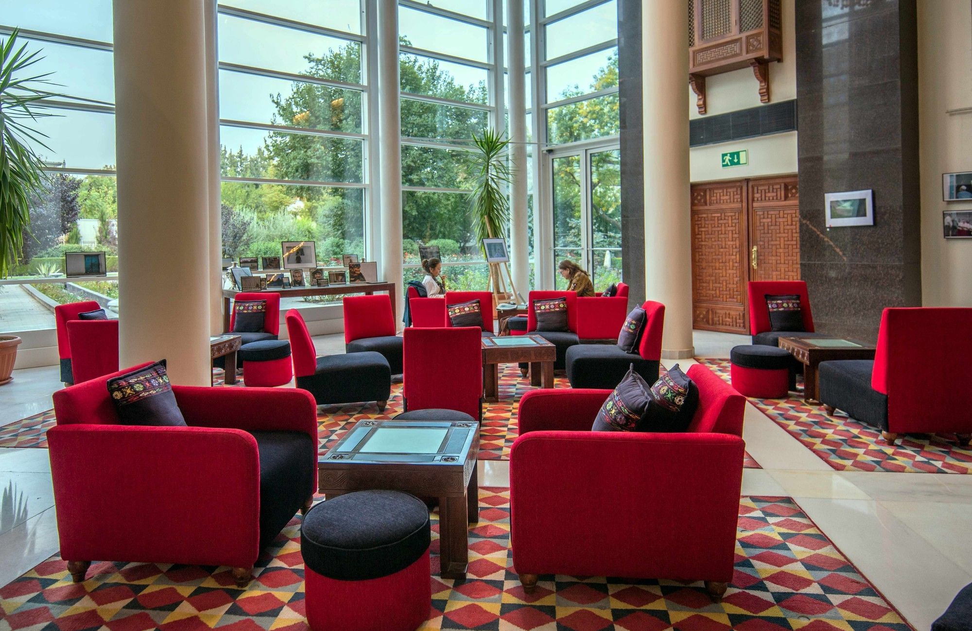 Framed by panoramic views of the city, the Resident’s Lounge is designed as a serene and welcoming environment. Wood-panelled walls, glazed ceramic tiles, and soft upholstered seating adorned with traditional Tajik Atlas patterned fabrics create an atmosphere of quiet elegance — a refined space for relaxation, conversation, or informal meetings.