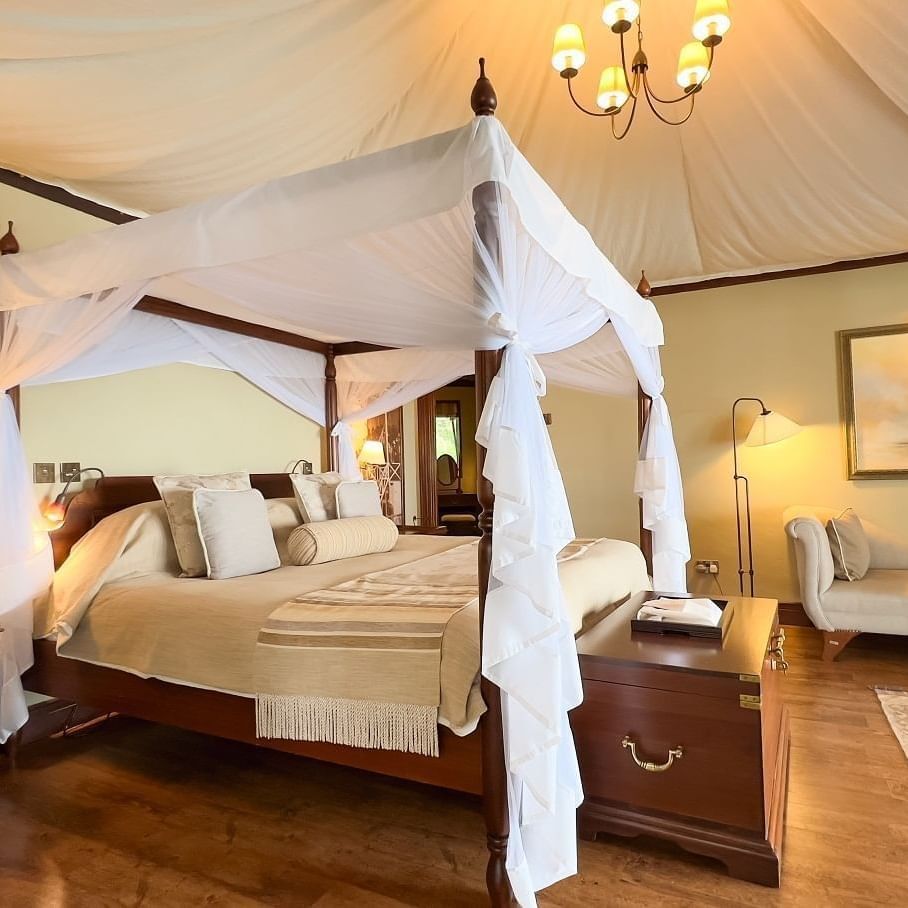 Each tent features a plush king-sized bed with mosquito netting, a cosy sitting area and décor inspired by classic British heritage./p>