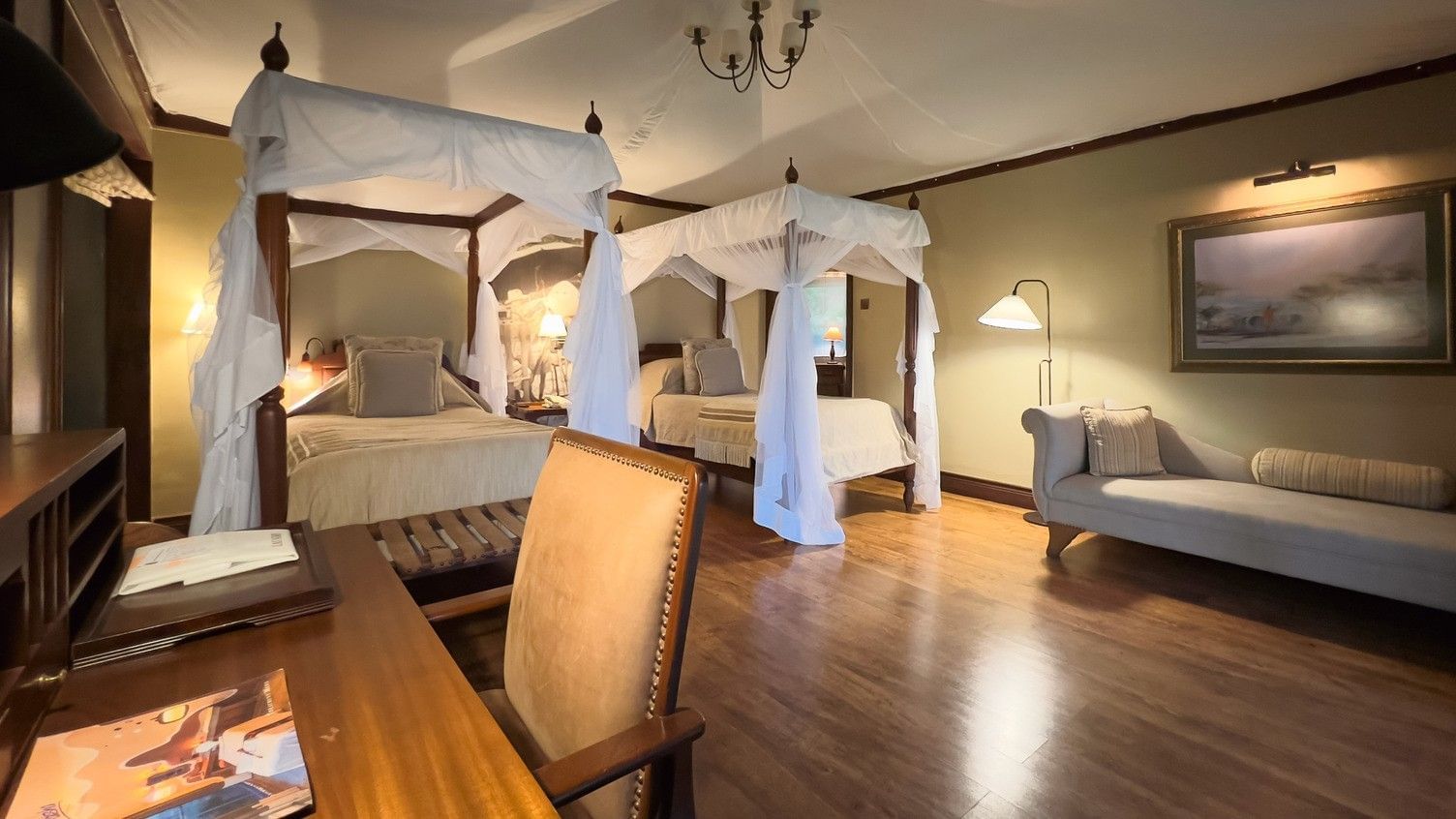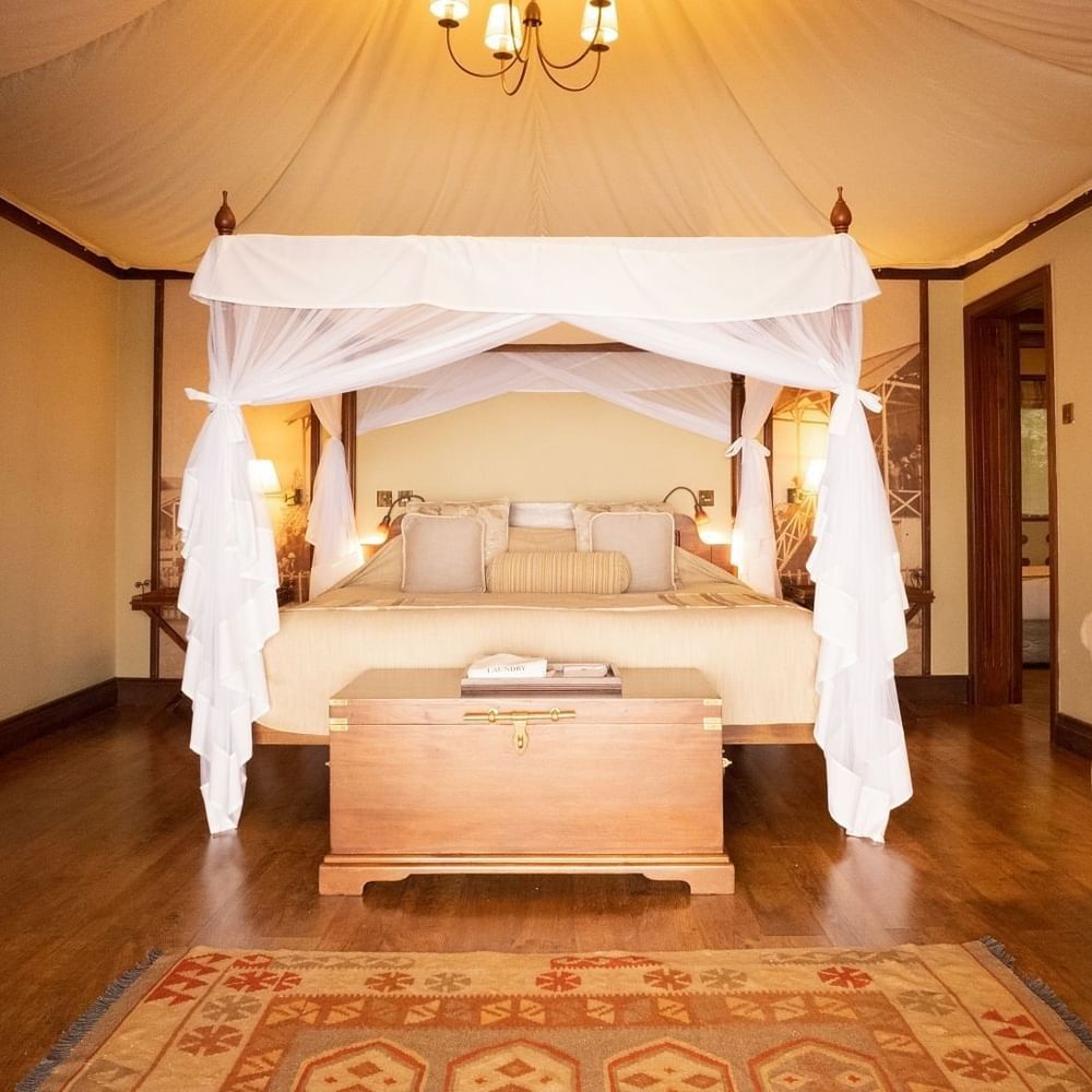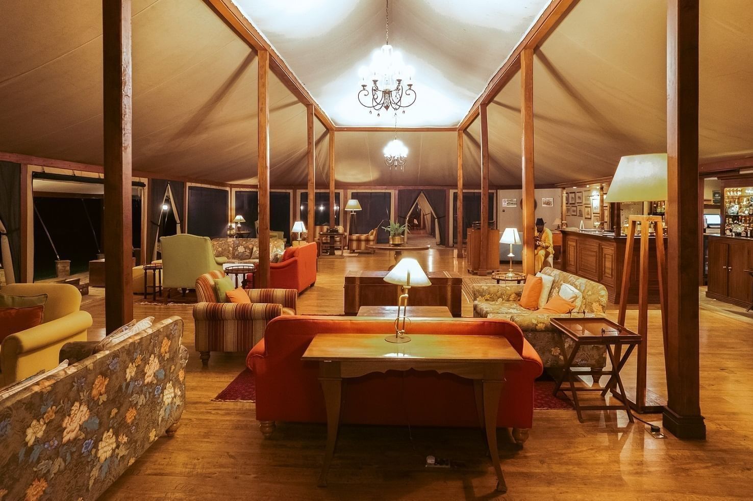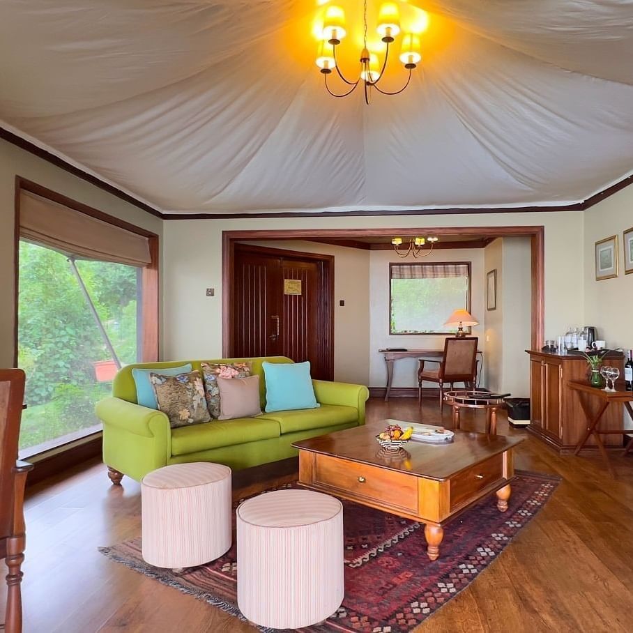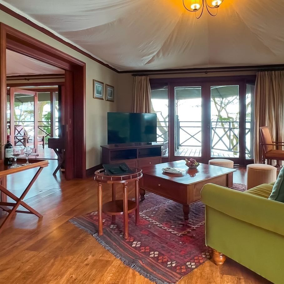This is the camp’s signature sanctuary, designed for those seeking privacy, space, and indulgent comfort. Set apart from the other tents, this expansive suite features a separate king bedroom, a tastefully furnished lounge with a television and mini-fridge, and vintage-inspired interiors that echo early 20th-century elegance.
