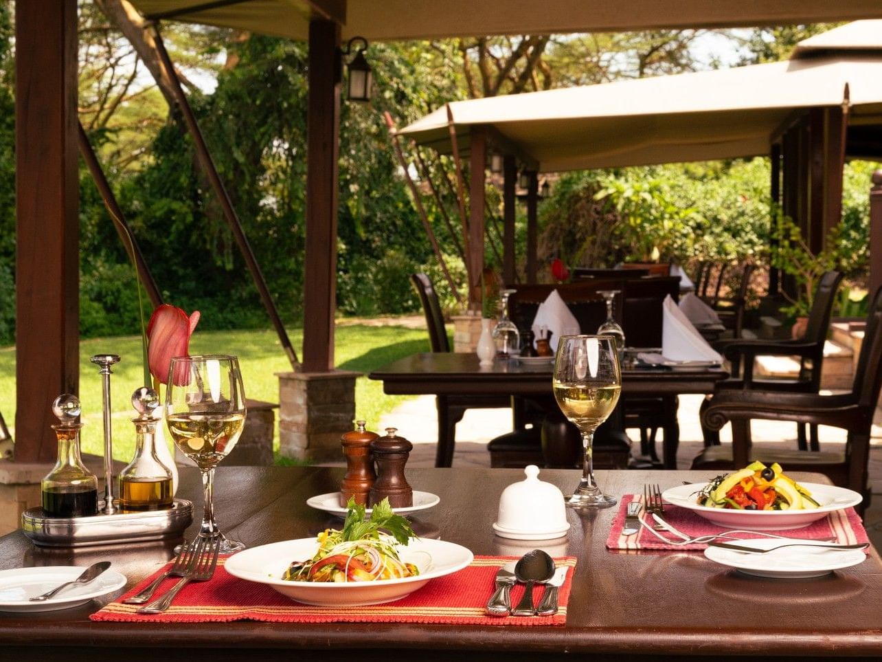 Lunch features classic dishes such as rack of lamb with mint sauce and vibrant vegetarian platters. For dinner, a curated table d’hôte menu includes soup, entrée, dessert, cheese and crackers, paired with fine Kenyan tea or coffee. Wine and fresh juices are also available to complement your meal.