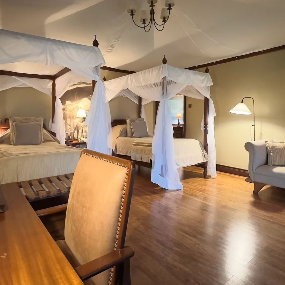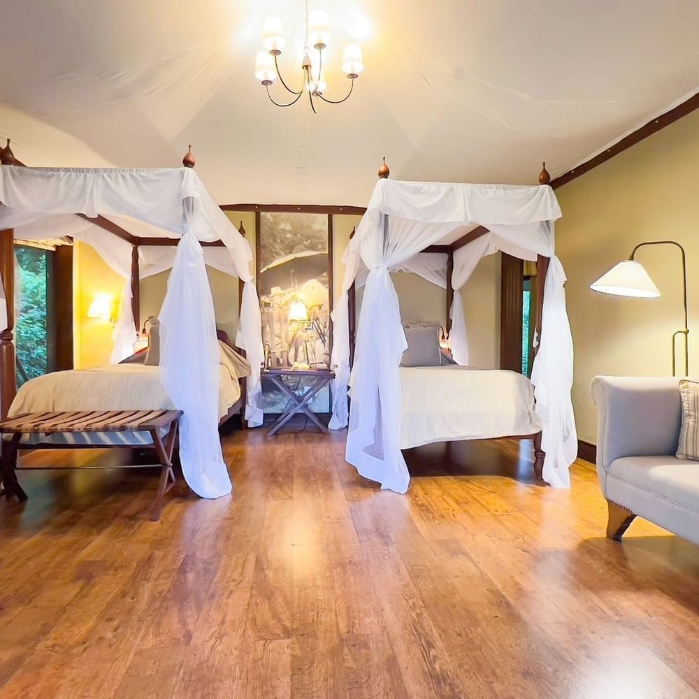 Perfect for friends or family travelling together, our Deluxe Twin Tents feature two plush twin beds and a private balcony overlooking the lake. Designed with understated safari elegance, interiors blend natural textures with vintage-inspired details.