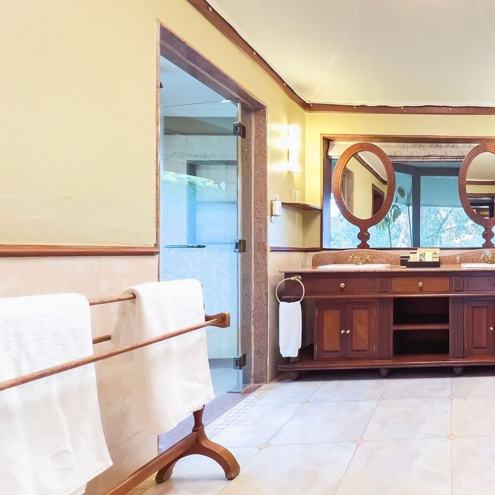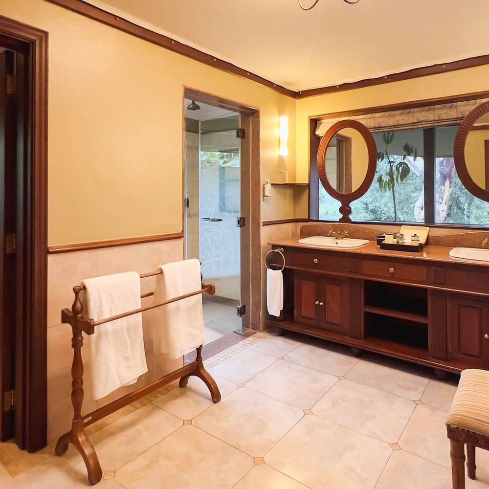 The ensuite bathroom features double vanities and a spacious his-and-hers shower, ideal for unwinding after a day of exploring the conservancy. Stay connected with complimentary Wi-Fi and enjoy fresh tea or coffee from your in-room station. Every detail offers a refined, immersive safari retreat.