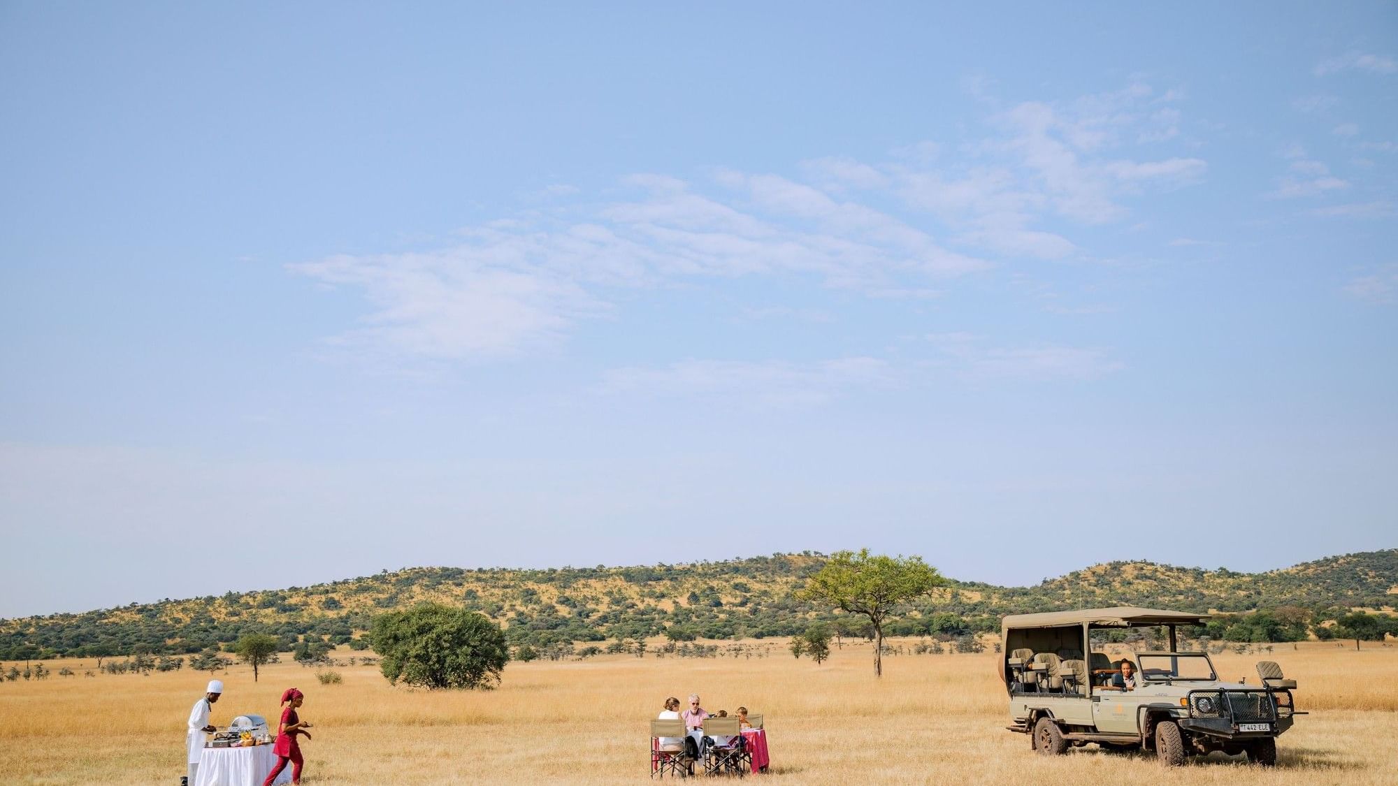 As the sun rises, drift silently above the plains, passing over hippo pools on the Grumeti River and wildlife gathered below. The flight lasts about 45 minutes, guided by an expert pilot, before a gentle landing on the open plains.