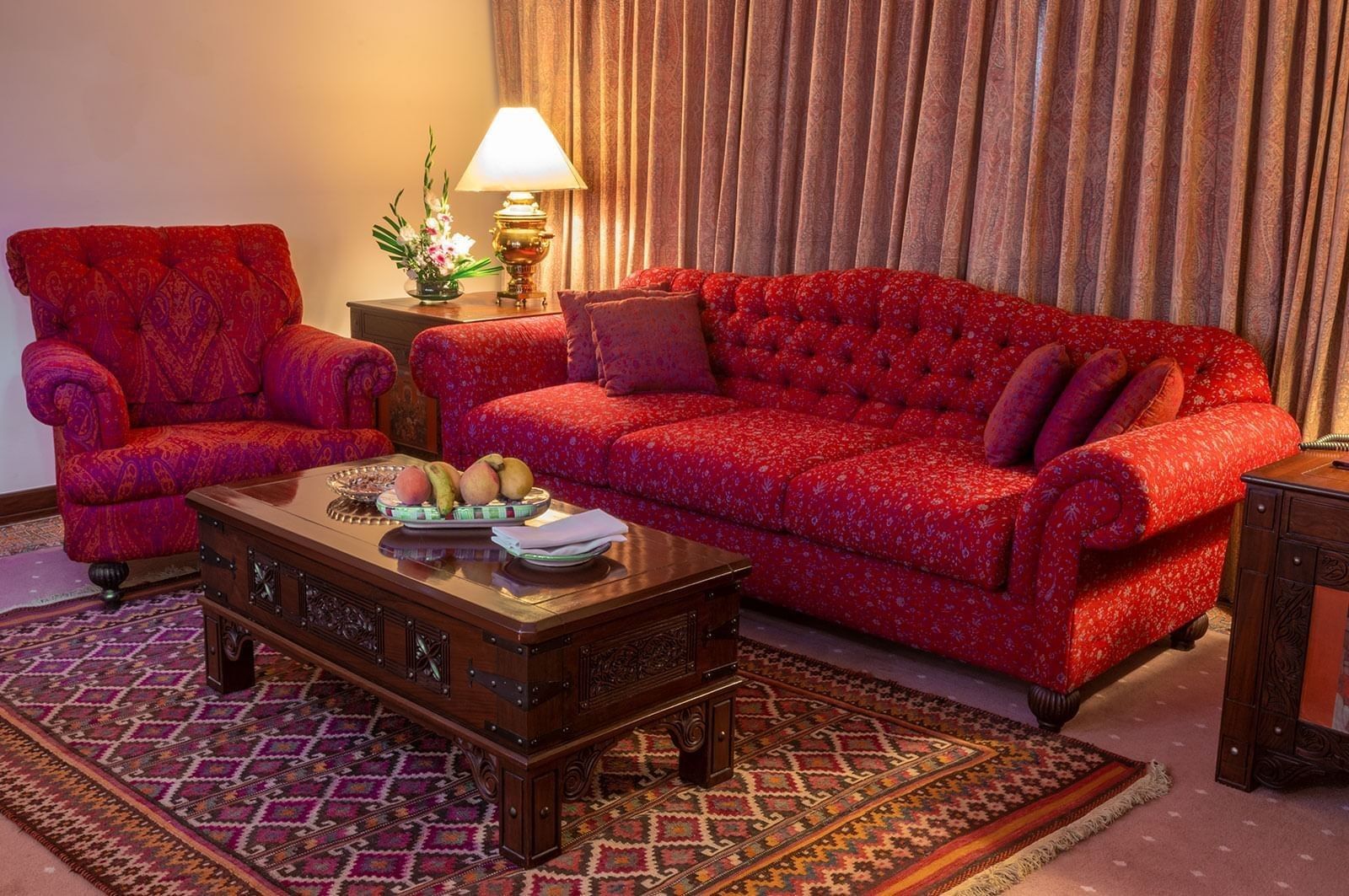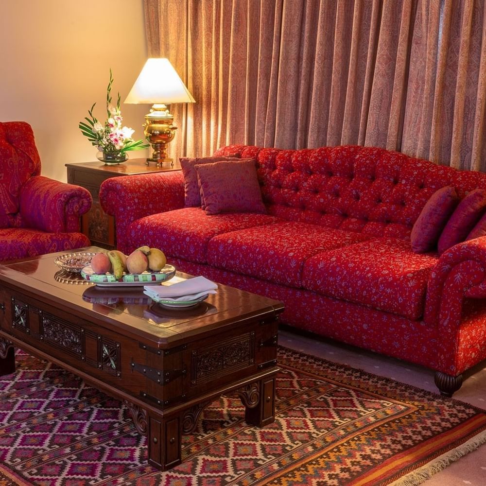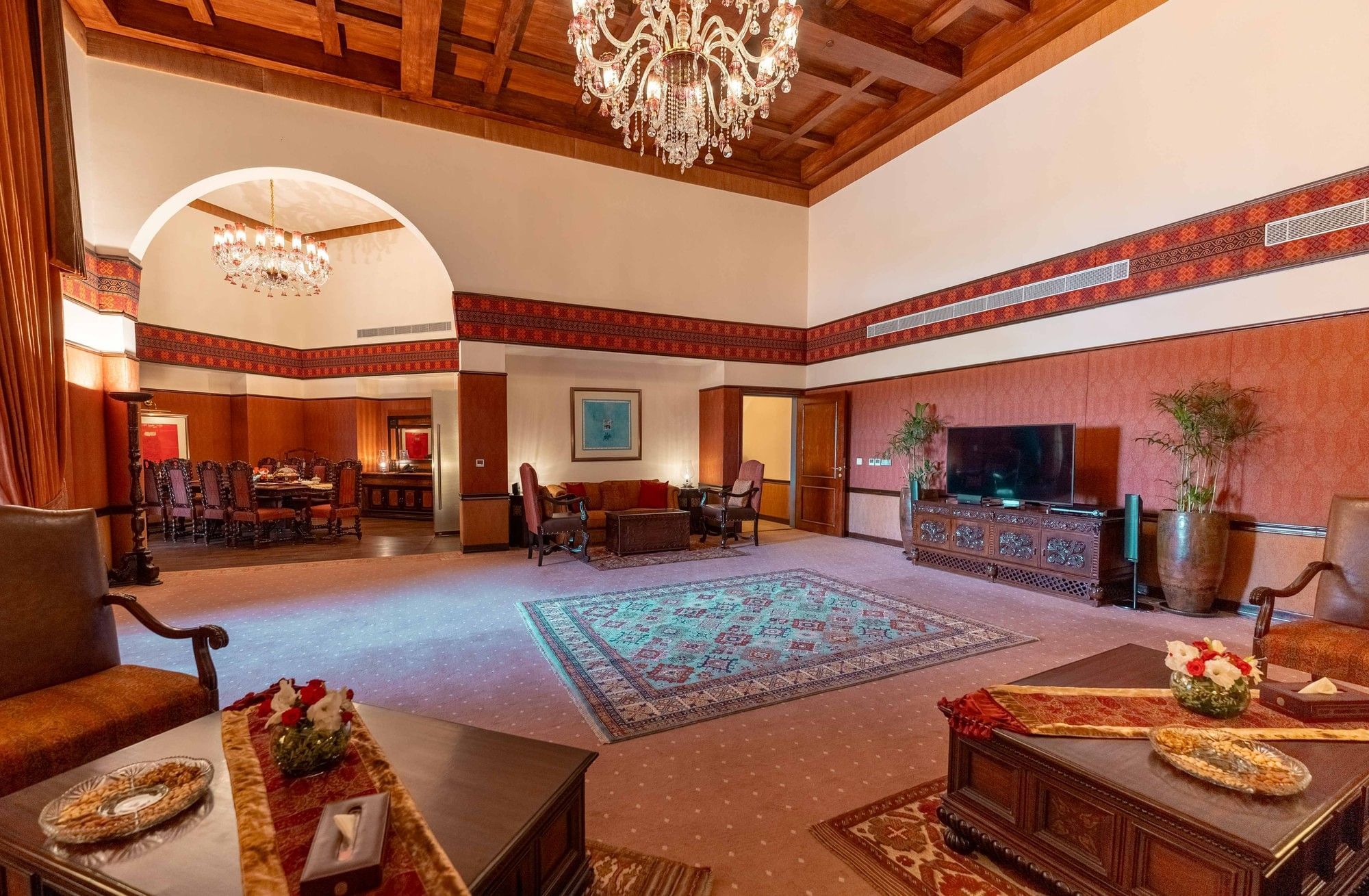 Elegantly furnished Presidential Suites with large rug and chandelier at Islamabad Serena Hotel in Islamabad.