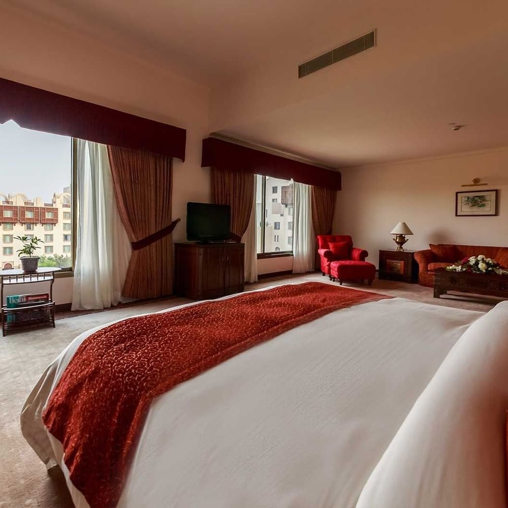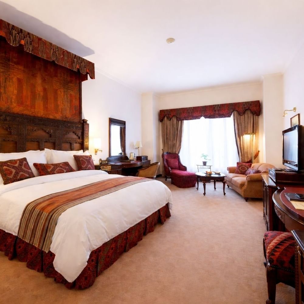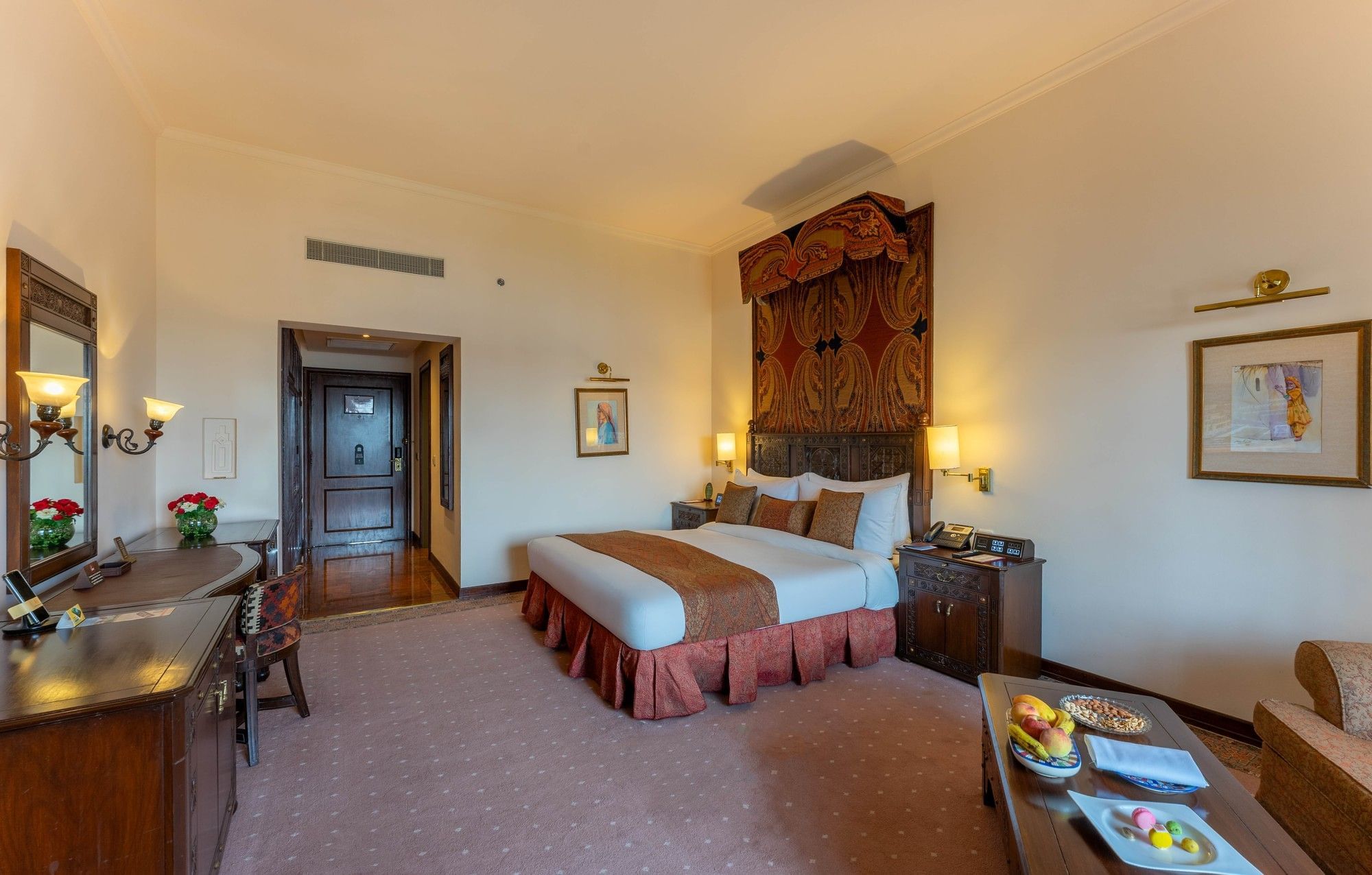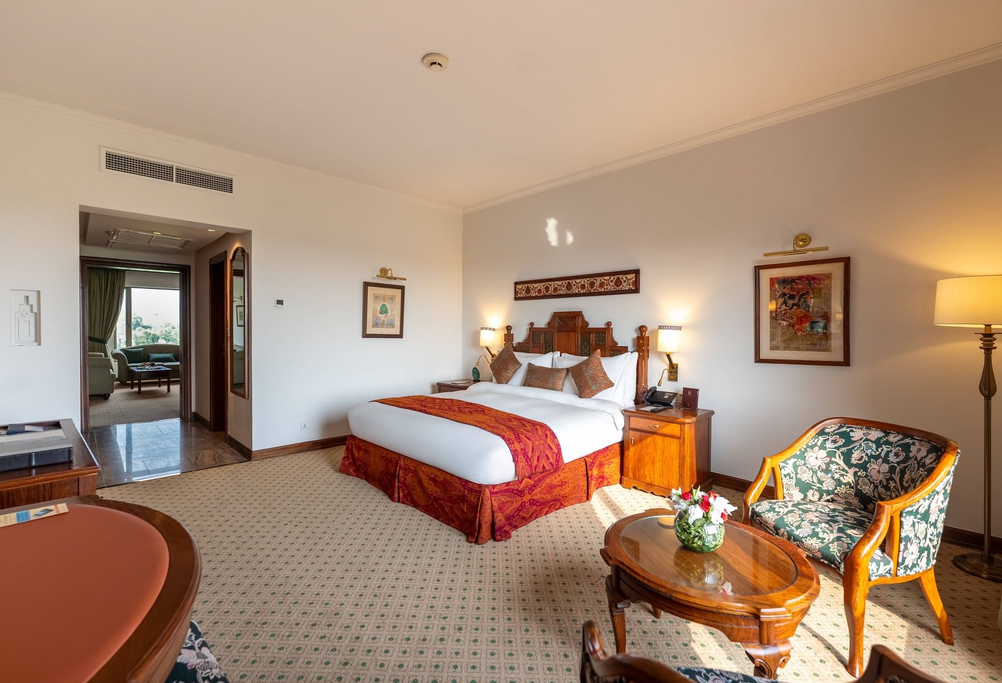 The Deluxe Room offers a tranquil escape with serene views of the hotel’s landscaped gardens and the city beyond. It offers king sized or twin beds, complemented by elegant furnishings and modern conveniences.  The room offers a dedicated dressing area with a vanity, a stocked minibar, in-room coffee and tea facilities, and 24-hour room service for added convenience. A well-appointed bathroom completes the experience with thoughtful touches. Interconnecting rooms are also available for families and groups.