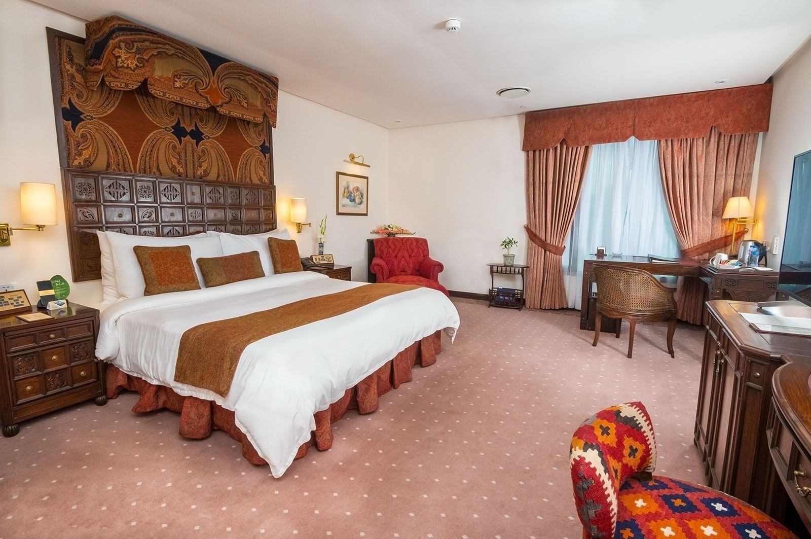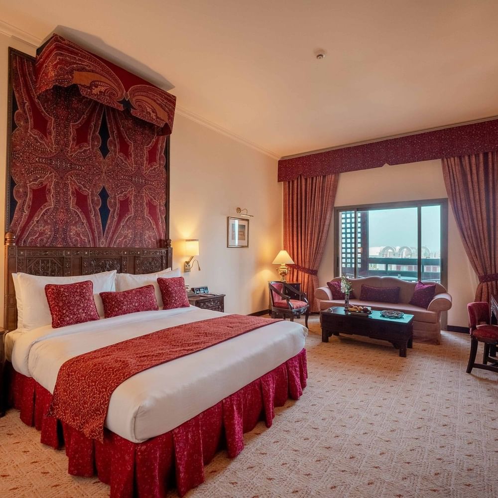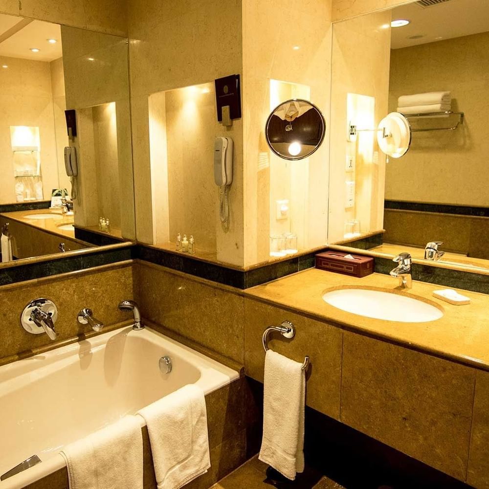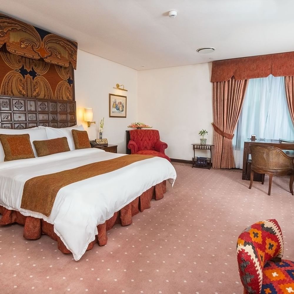 The Deluxe Room offers a tranquil escape with serene views of the hotel’s landscaped gardens and the city beyond. It offers king sized or twin beds, complemented by elegant furnishings and modern conveniences.  The room offers a dedicated dressing area with a vanity, a stocked minibar, in-room coffee and tea facilities, and 24-hour room service for added convenience. A well-appointed bathroom completes the experience with thoughtful touches. Interconnecting rooms are also available for families and groups.