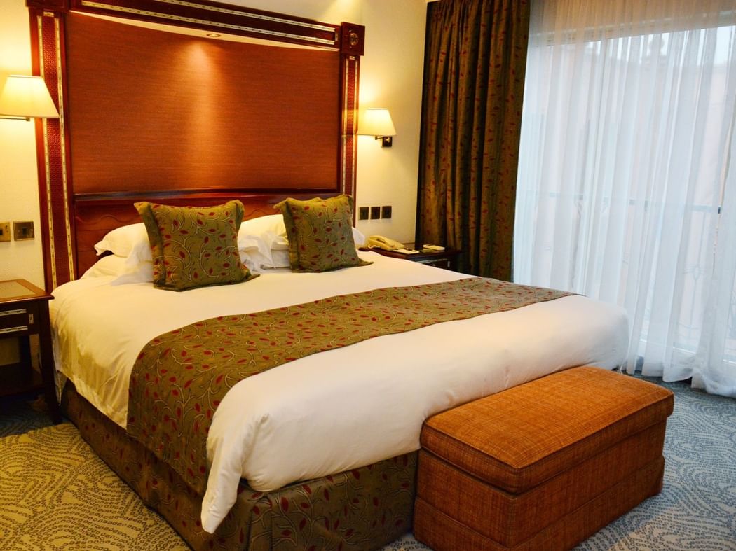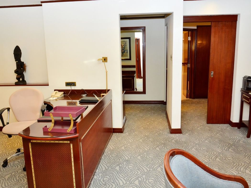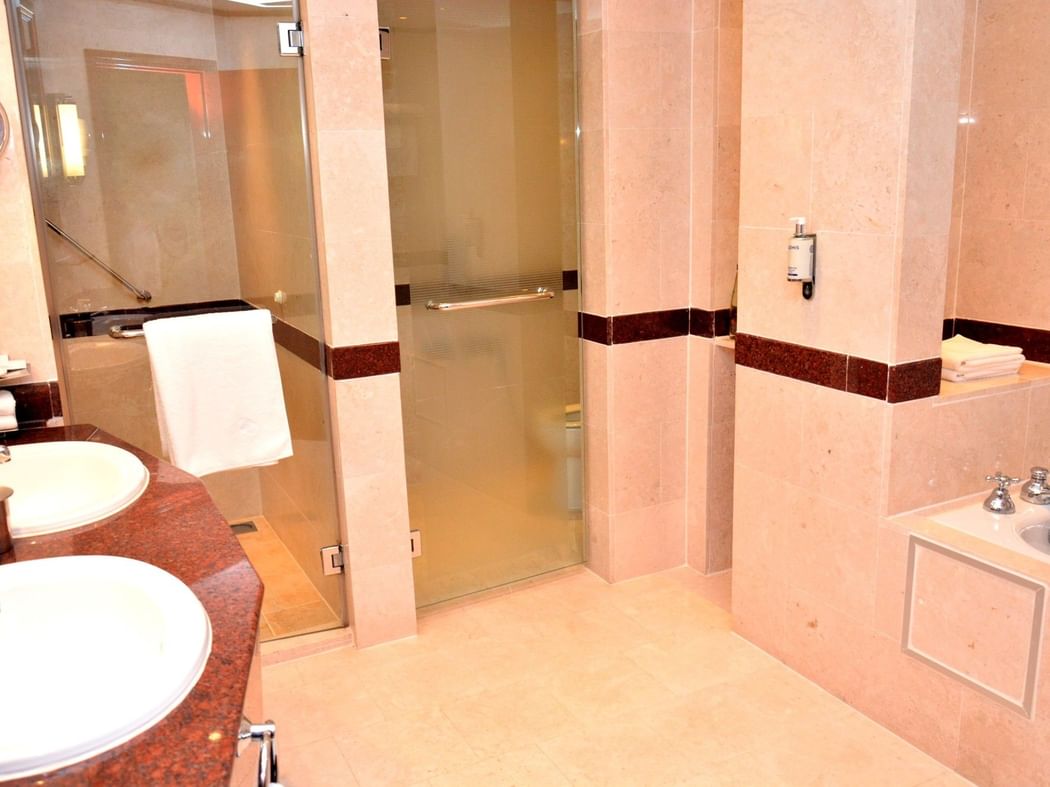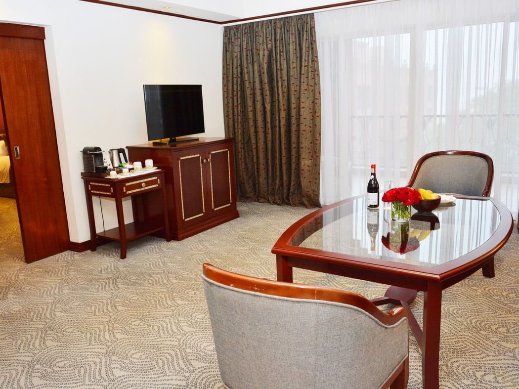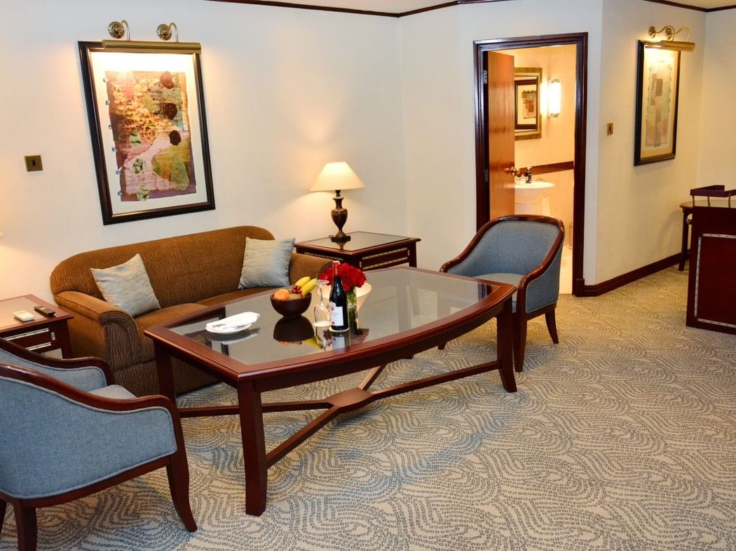 The Executive Suites offer a well-separated living room and bedroom, accessible through both a main entrance and a sliding internal door. Featuring a king sized bed, private balcony, spacious living room with plush seating and a fully equipped business desk, it is the perfect choice for guests that intend to have private meetings from the room. The bathroom boasts a double sink marble vanity, walk-in shower and a bathtub. Room amenities include smart IPTV, minibar, tea/coffee making facilities, private safe, wireless internet connectivity, hairdryer, direct dial telephone and air-conditioning.