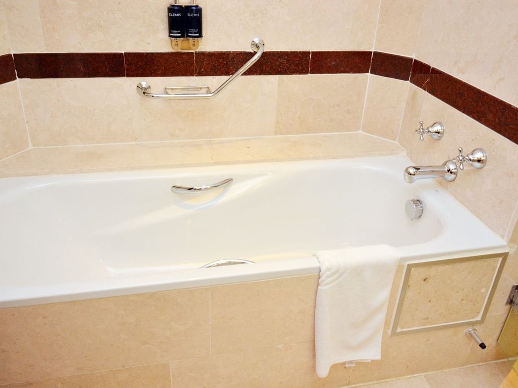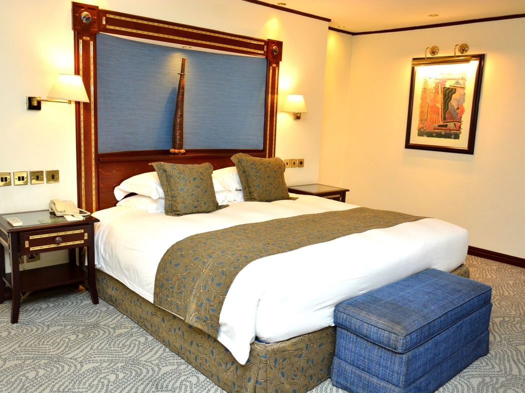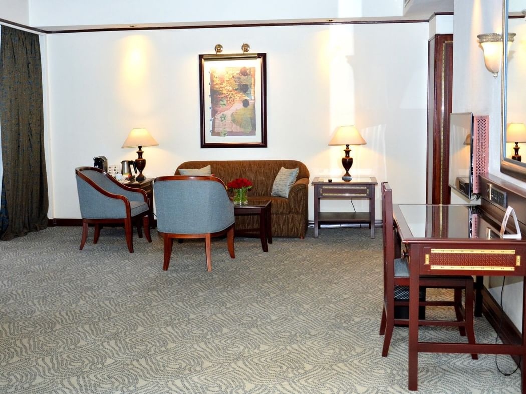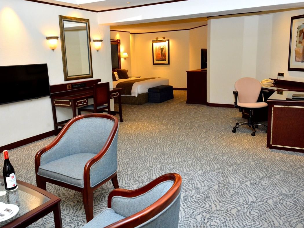 These elegant open-plan suites feature a large king size bed, private balcony and an expansive living area with comfortable sofas, a round coffee table and a dedicated workspace. The suite is equipped with two smart IPTV units serving both the sleeping and living areas. The bathroom is generously sized with double sink marble vanity, a walk in shower, separate bathtub. Additional features include a minibar, tea/coffee making facilities, private safe, wireless internet connectivity, hairdryer, private safe, direct dial telephone and air-conditioning.