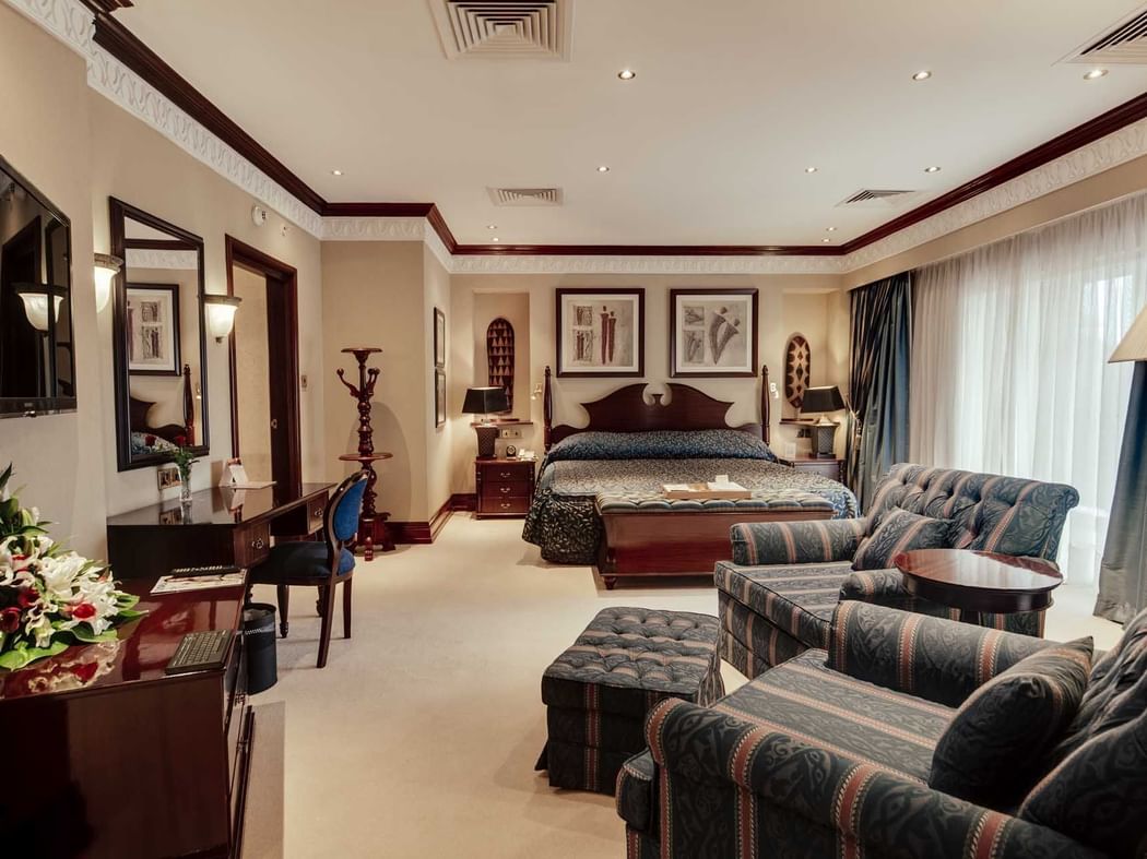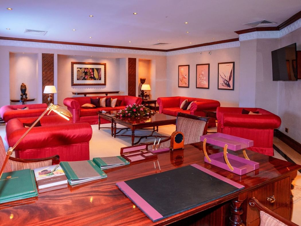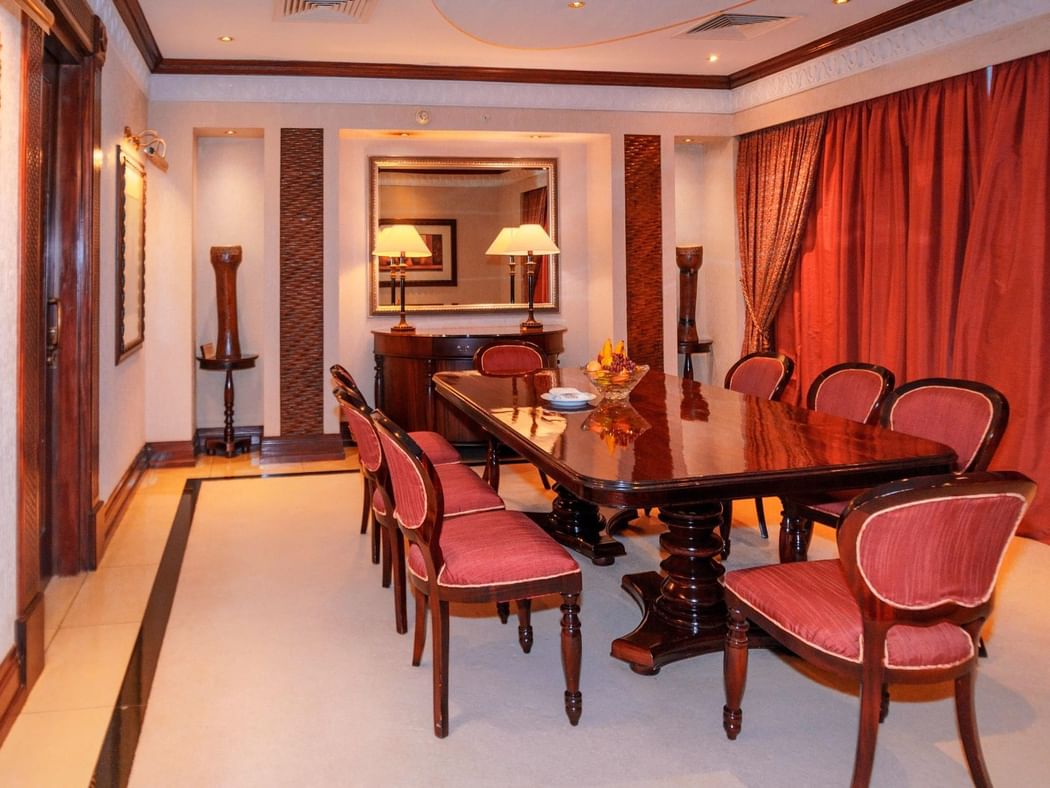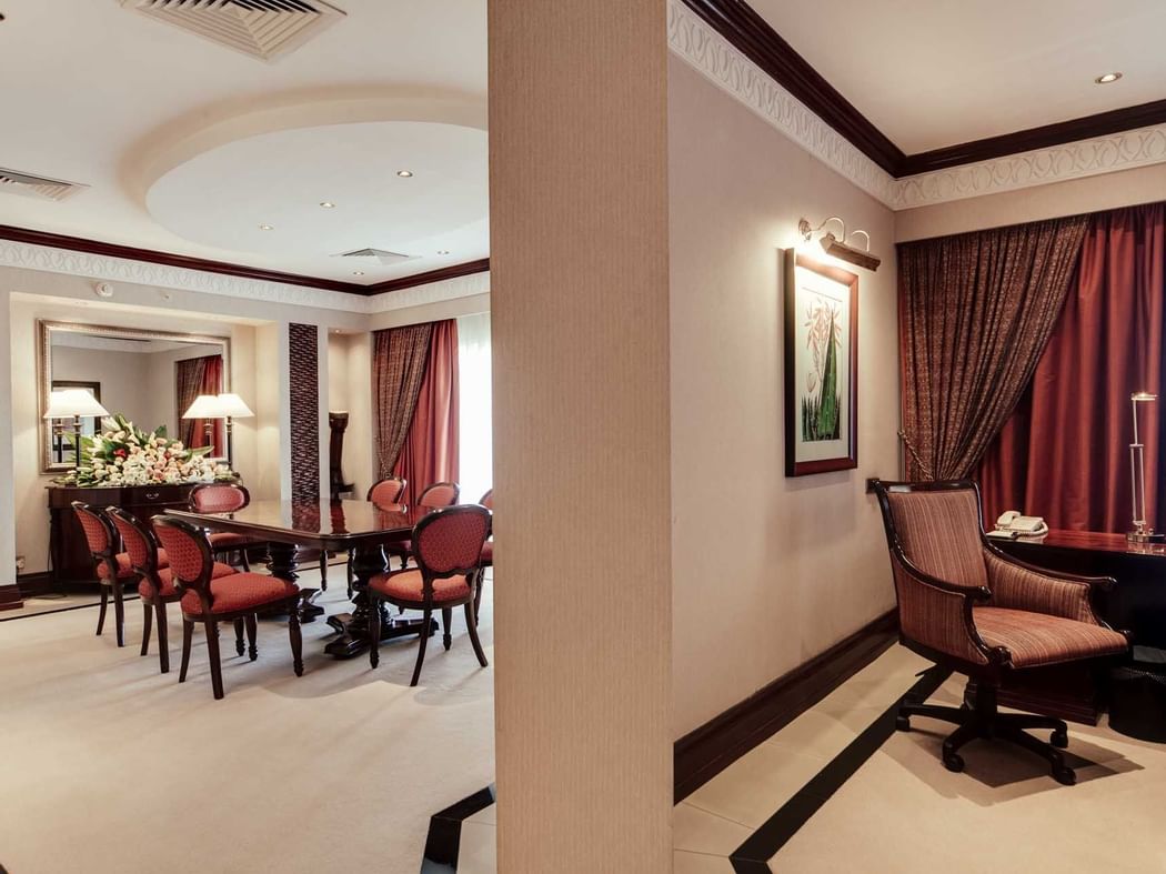 The splendid two bed roomed Royal Suite offers an expansive king size master bedroom with a private balcony and work desk. The suite features a grand living room with its own work space, a formal dining area and kitchenette. A beautifully designed reception foyer provides separate entrances to the bedroom and living areas.