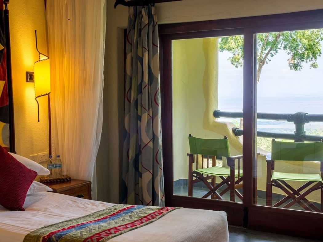 Spread along the edge of the cliff to allow for the most incredible views, our accommodation consists of circular, double-storey, whitewashed “rondavels” (traditional circular buildings with conical thatched roofs), which include their own small veranda. The interior décor echoes the blue of the lake and the pink of its flamingos. Behind each bed hangs a spectacular hand-woven rug, while furnishings and fittings reflect traditional Maasai beadwork.
