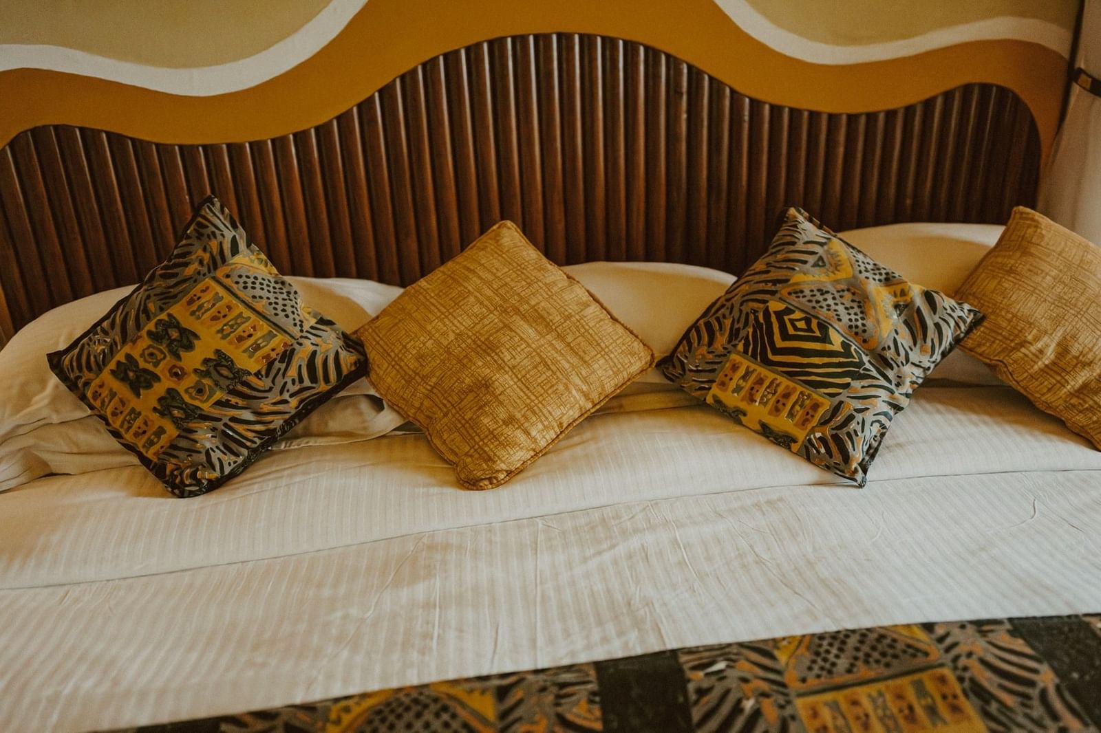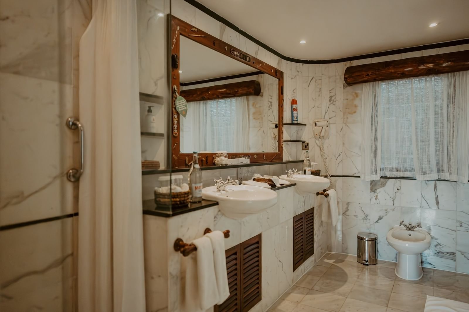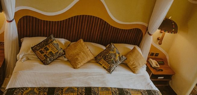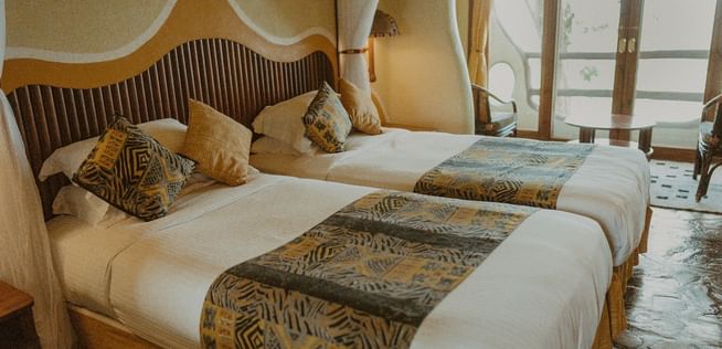 Adorned in swirling patterns that reflect the colours and shapes of the bush, rooms feature Maasai-inspired design-motifs, King or twin beds, lavish, all-encompassing mosquito-curtaining and marble bathrooms with walk-in showers.