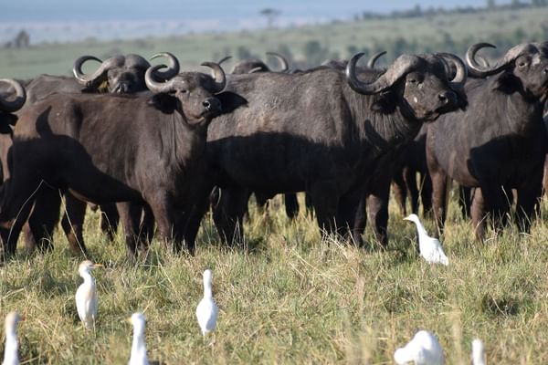 Jeep along a steppe nearby bulls at Mara Serena Safari Lodge