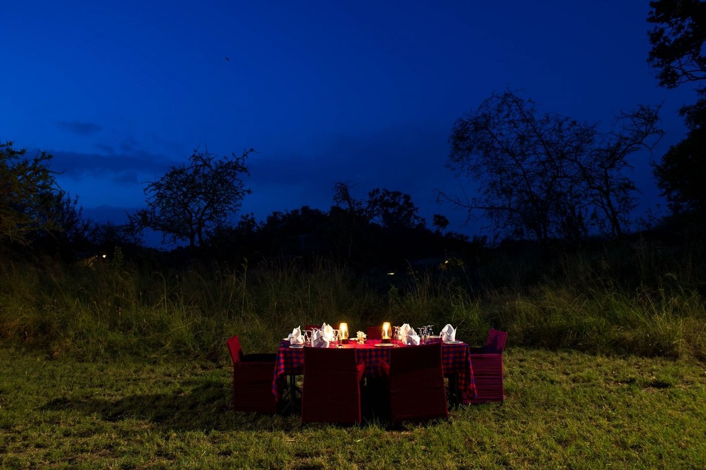 Exterior view of tent at night at Mbuzi Mawe Serena Camp