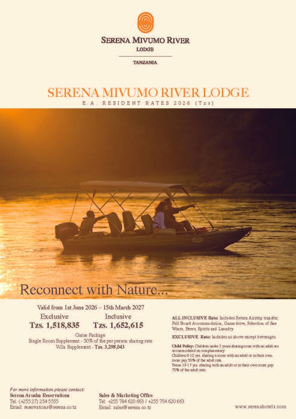 T: (+255) 786 999060 T: +255 784 500 147 T: +255 738 157 778 E: selousreservations@serena.co.tz