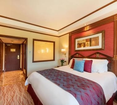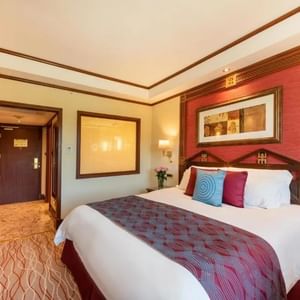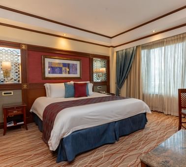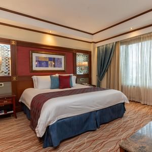 Elegantly styled and generously spacious, the suite includes a separate bedroom with sumptuous king-sized bed, a lavish bathroom with both a bath and a shower and a sophisticated art deco-style lounge equipped with sofas, a T.V and a writing desk. Additionally, the suite features a dining area with seating for four and a guest washroom.