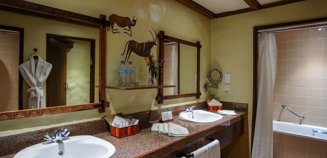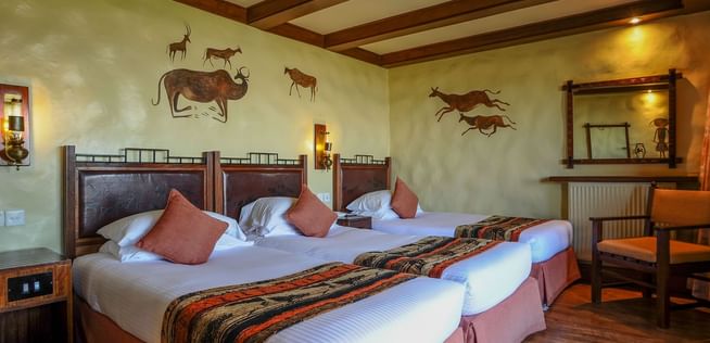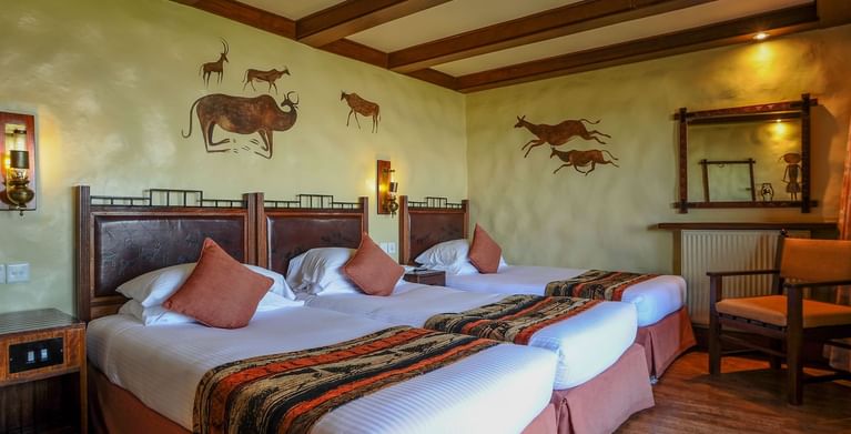 Interiors feature brass lamps, embossed leather headboards, wildwood mirrors, Maasai carvings and stylised cave paintings. The guest experience is enhanced with modern comforts like complimentary wireless Internet and 24-hour room service.