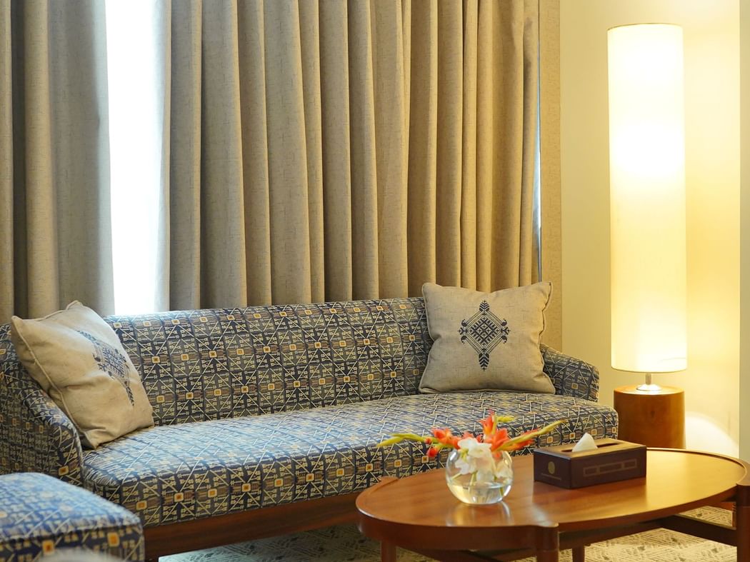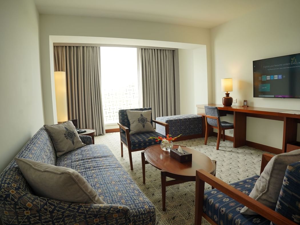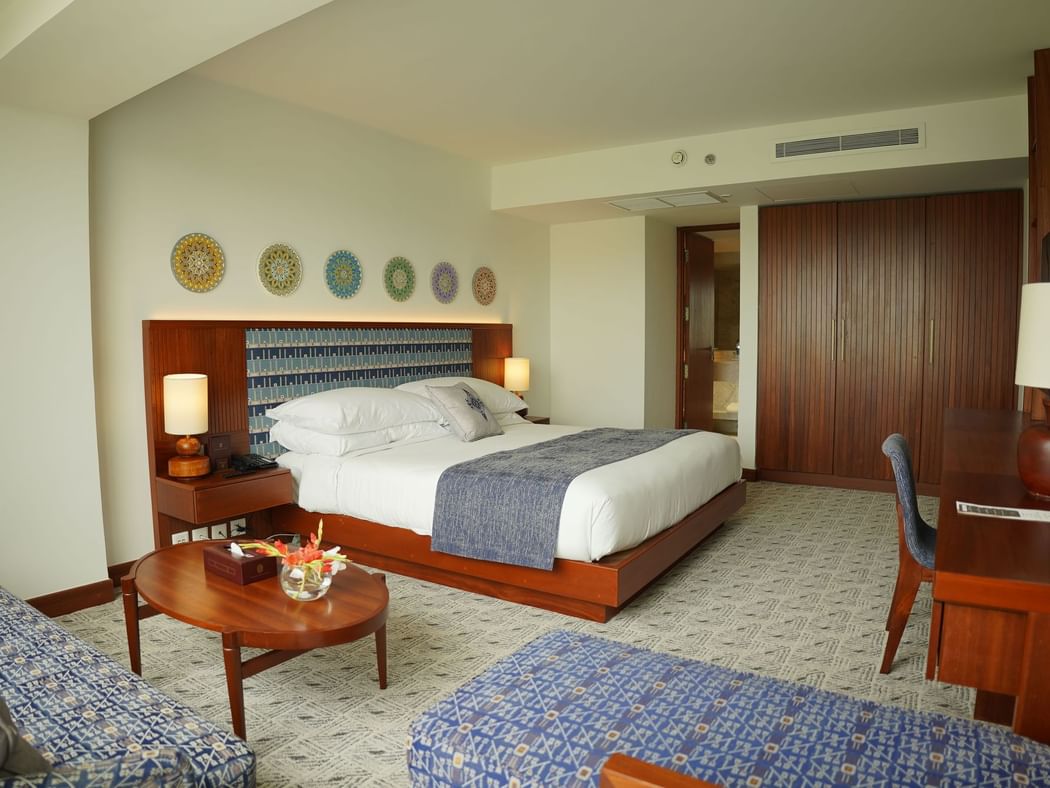 The spacious Executive Suite features delightful garden views, a king size bed, an attached bathroom, a separate sitting area, an office desk, a safety deposit box, and an array of indulgent amenities.