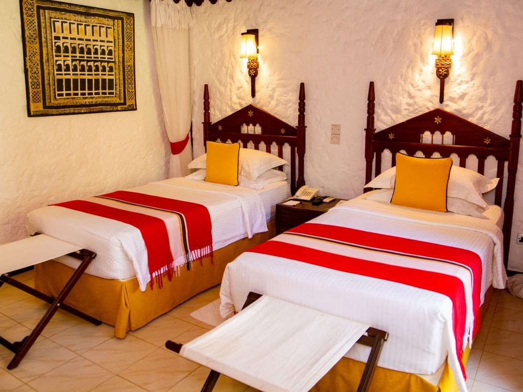 Located in the garden wing of the hotel, the Deluxe Twin Garden Rooms are surrounded by lawns as well as palm trees and look down across the grounds to the sea. Decorated in cool sea blue and white, each spacious room has two twin beds. Double doors open onto either a private balcony or a terrace with direct access to the grounds.