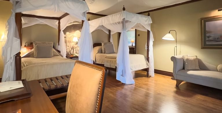 For those looking for an extra level of indulgence, we offer our sumptuous Flamingo Suite, which showcases a separate bedroom, a television with cable access, a mini-fridge and an expansive bathroom with a Jacuzzi overlooking the lake. It’s perfect for honeymoons and special getaways!