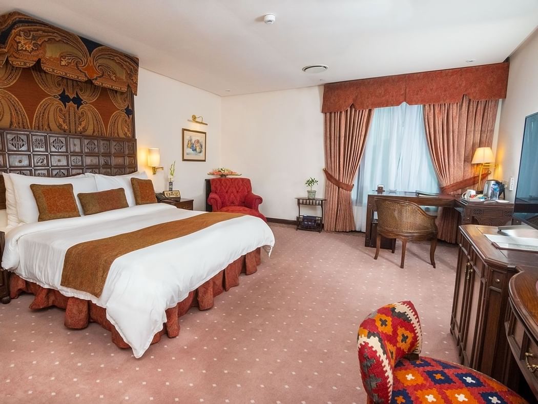 The spacious Executive Suite features delightful garden views, a king bed, an elegant attached bathroom, a separate sitting area, a working desk, a safety deposit box and an array of indulgent amenities. You’ll appreciate complimentary access to Nazara Executive Lounge, up to four pieces of laundry service per day, complimentary local calls, a daily newspaper, and the use of our fully-equipped gym and outdoor swimming pool. Enjoy different amenities including daily buffet breakfast in Zamana Restaurant.