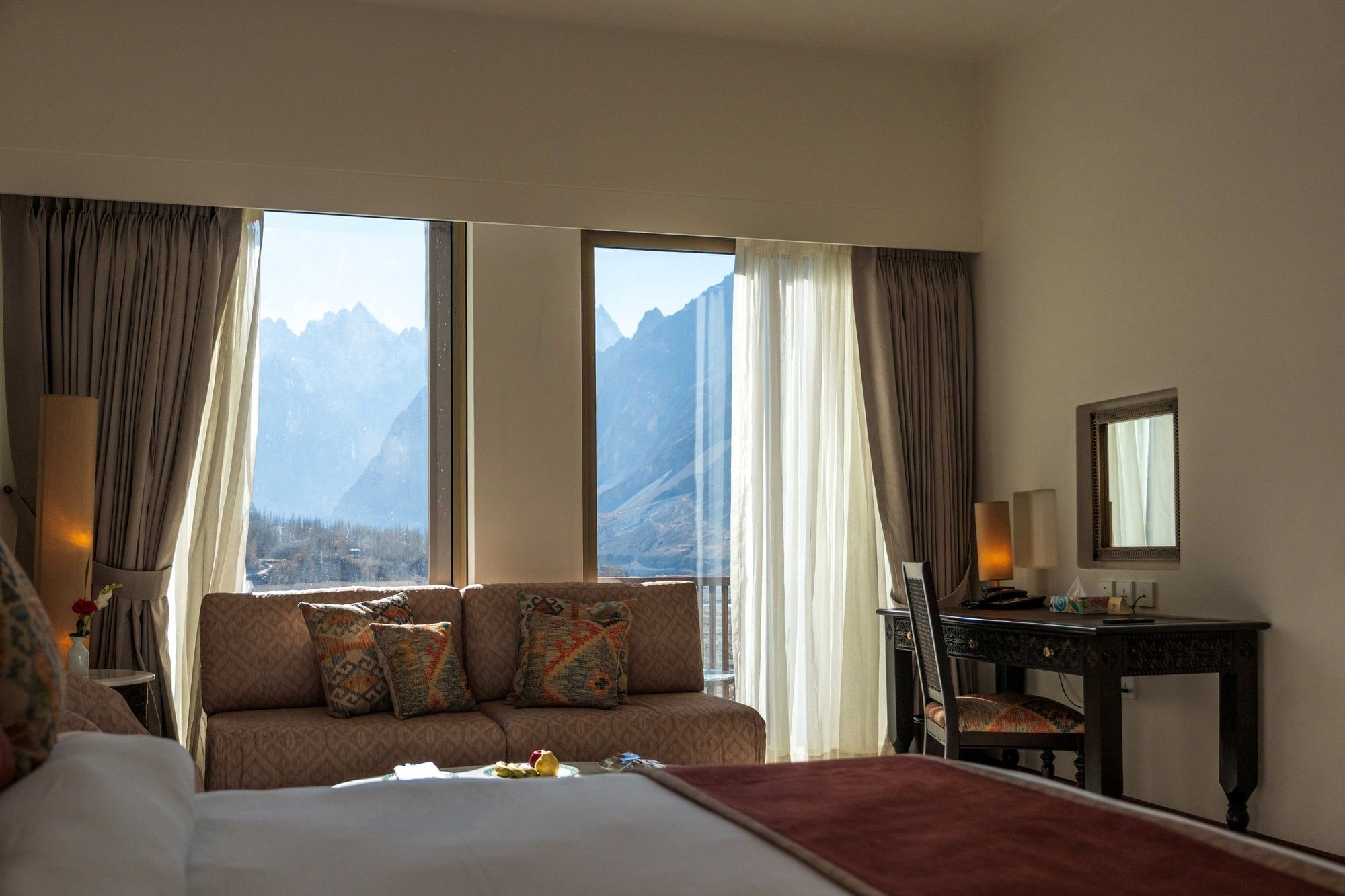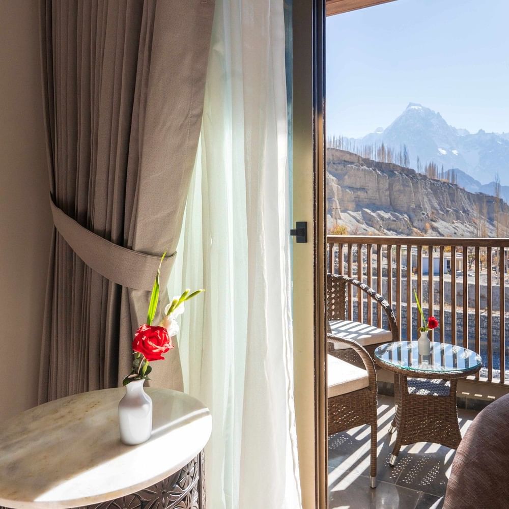Our Deluxe Rooms provide extra space and tranquility. These rooms feature a plush queen or twin beds, spacious seating area, high-speed Wi-Fi, a minibar, and deluxe bedding. Large windows or private balconies frame sweeping views of the Karakoram peaks, offering a peaceful backdrop for rest and relaxation.