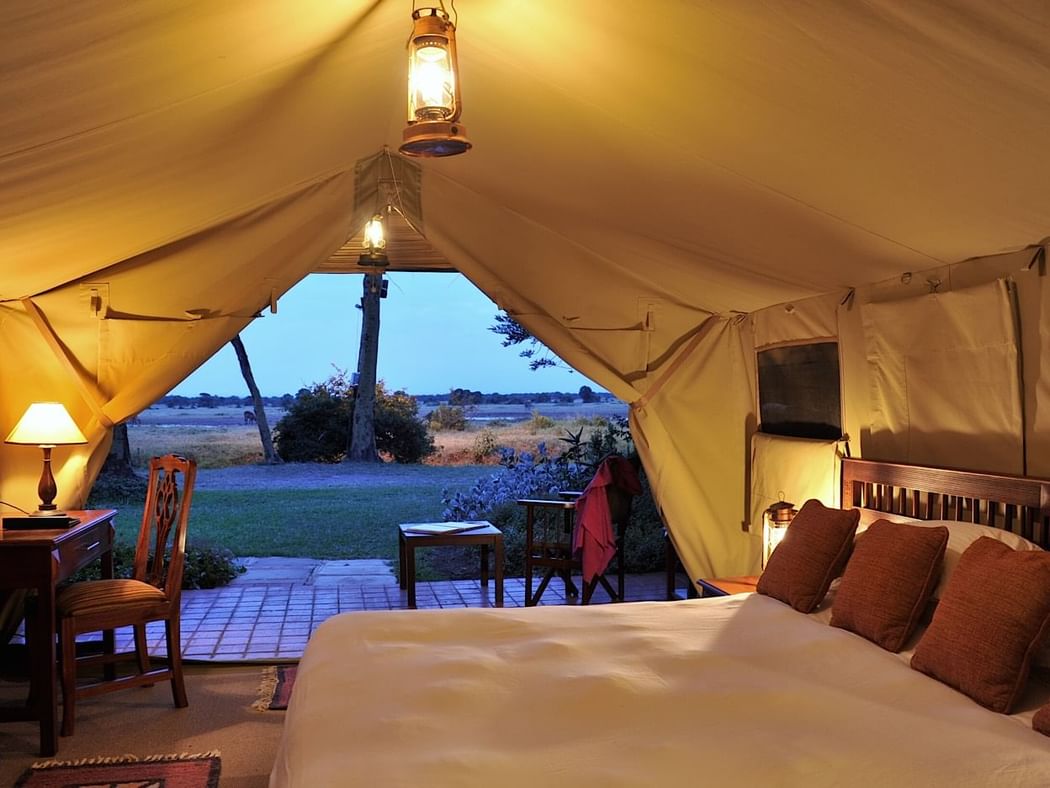 These spacious tents combine the traditional ambiance of a safari camp with the comforts of home. They offer either a king bed or two twin beds with the tents having views of the water hole; amenities include a bathroom with a one-hand washbasin, a WC and a shower with a shower curtain.