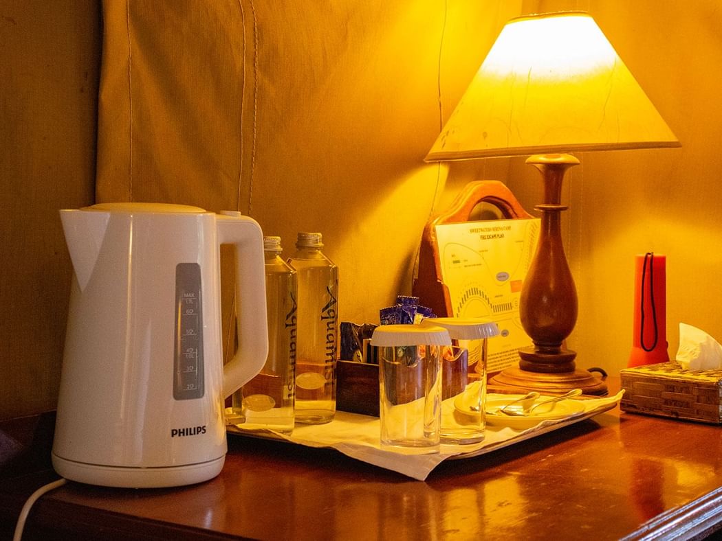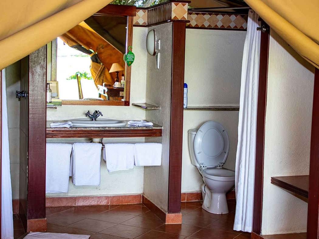 These spacious tents combine the traditional ambiance of a safari camp with the comforts of home. They offer either a king bed or two twin beds, amenities include a bathroom with a one-hand washbasin, a WC and a shower with a shower curtain.