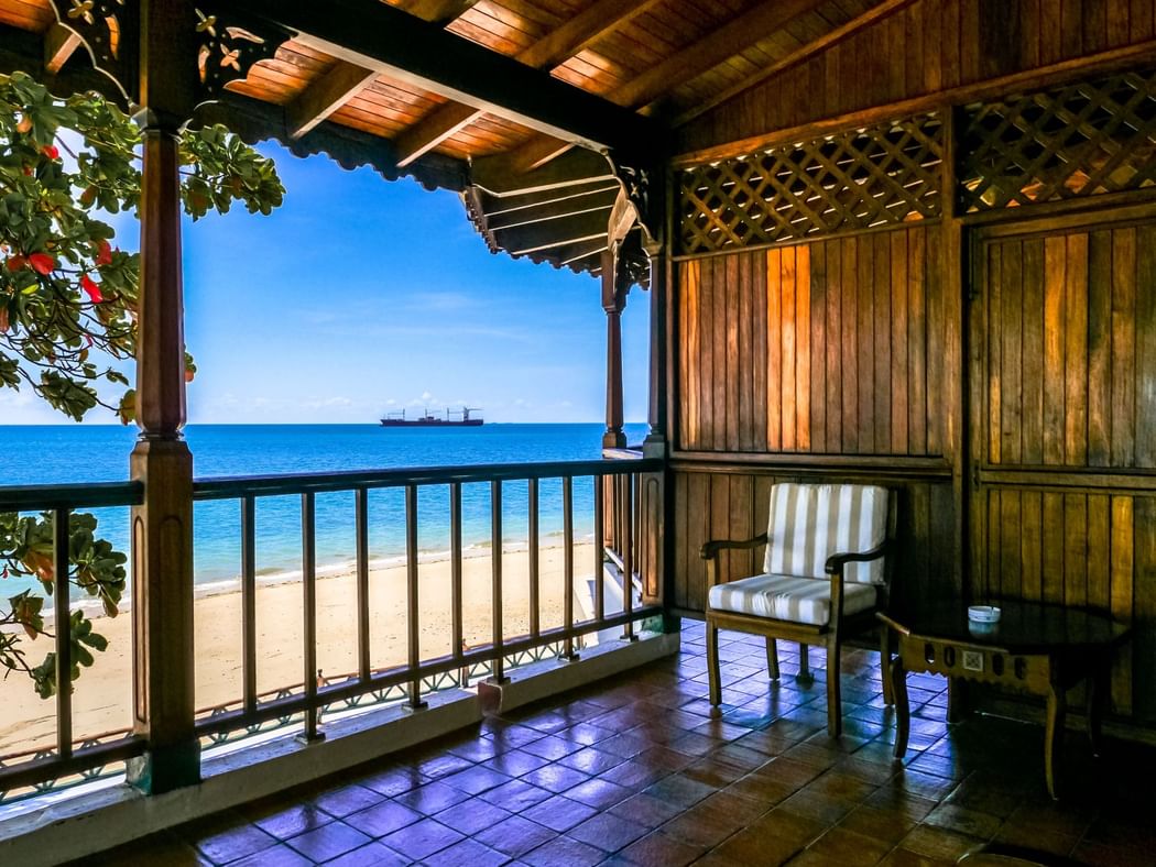 Honeymoon Prime Room which has an ocean view of the Indian Ocean, ideal for honeymooners or couples celebrating their anniversaries or engagement, which is presented in traditional Swahili style featuring traditional niches, fretwork cabinets and brightly colored coastal cotton soft furnishings in cool blue. The four-poster bed is draped in a mosquito net and is generously a king-sized bed which opens onto a magnificent L-shaped balcony with panoramic ocean views. It owns all fresco cocktail area and a double hammock