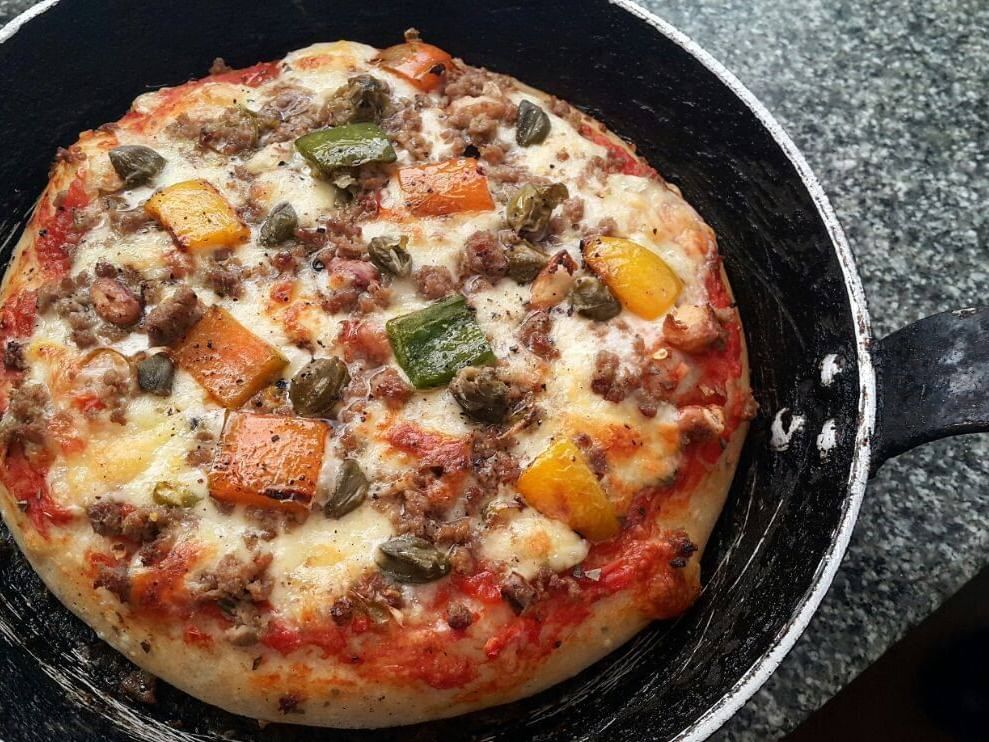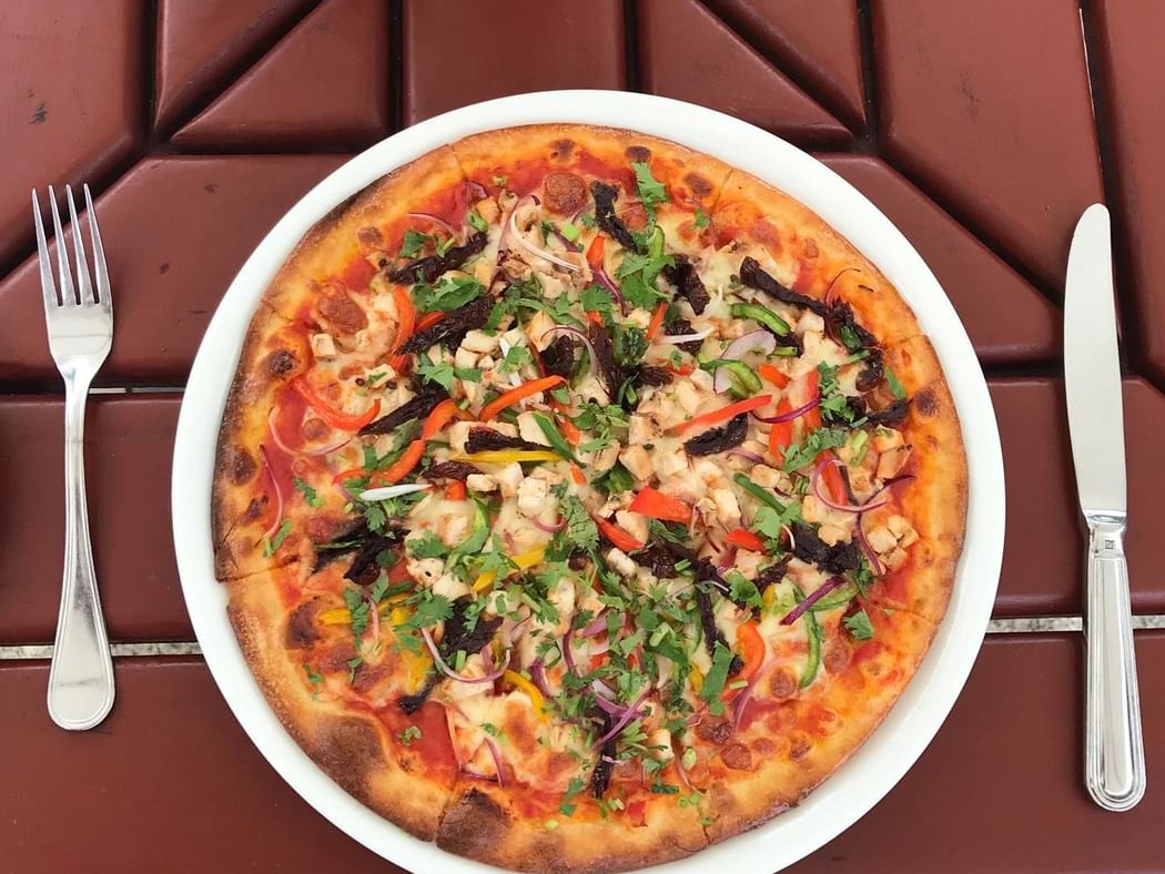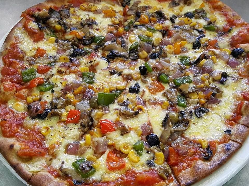 使用石头和木材火的正宗的砖比萨烤箱。 我们有各种新鲜的配料,包括素食,肉类和海鲜。 比萨饼店旁边的鱼塘俯瞰着一个巨大的开花九重葛和椰子树,从远处看,与织布鸟偶尔造访停留。