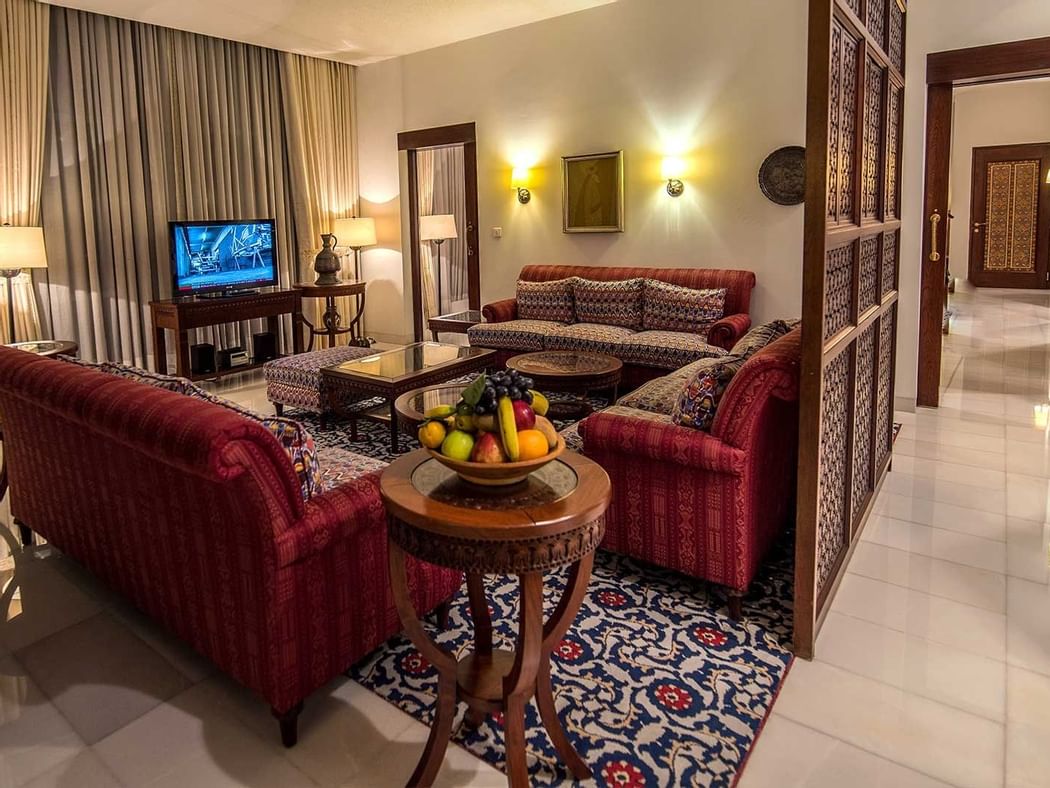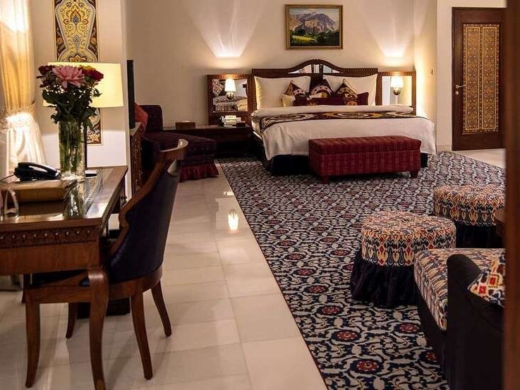 我们的总统套房展示了最极致的私密性,和工作人员谨慎细致的服务,这258平方米的套房内有一个美丽的室内花园,一张特大号床,豪华的床单和枕头,一个独立的生活区,带办公桌和典雅的木雕书柜的工作区,另外,我们为希望在套房内娱乐的客人设有一间用餐室和一间带厨具,冰箱,炉灶和微波炉的独立储藏室。住在熙熙攘攘的鲁达基大道内的希萨尔山总统套房的客人可享受额外的设施,并进入私人休息室,那里提供免费早餐,晚间开胃小菜,洗衣服务,专门的礼宾服务,会议设施等服务。