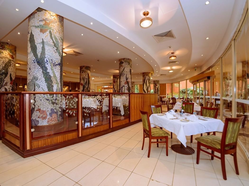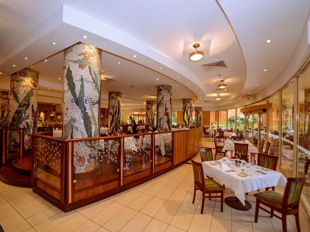 在巨大的拼花工艺的柱子之中,可欣赏到酒店辉煌的水上花园的景色,湖泊旁设有一个美丽的餐厅和一个迷人的户外露台。