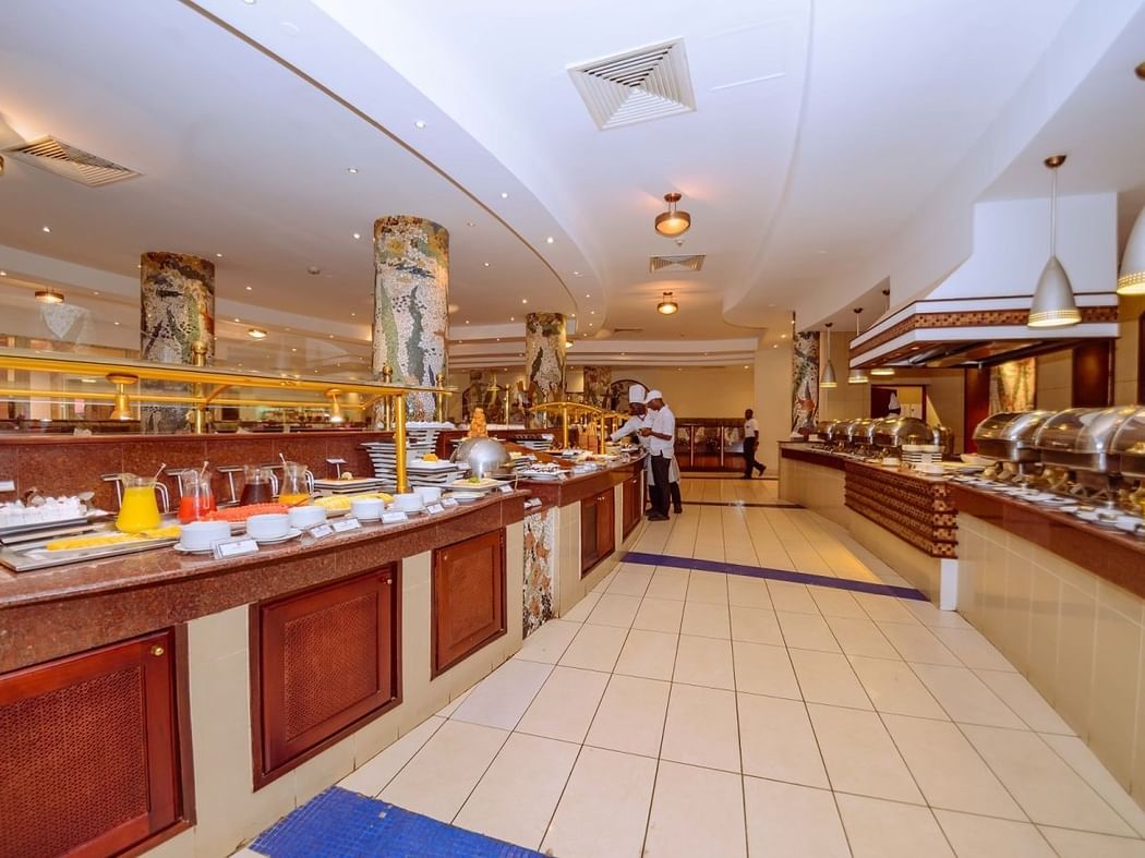早餐和午餐是以丰盛的冷热自助餐形式呈现的。 晚餐以夜间特色为主题,同时有点菜菜单。