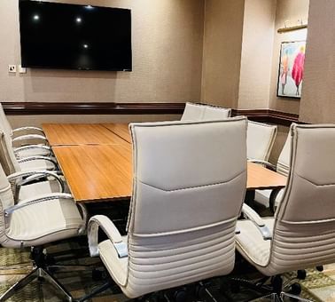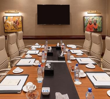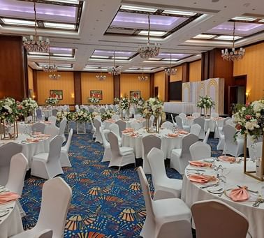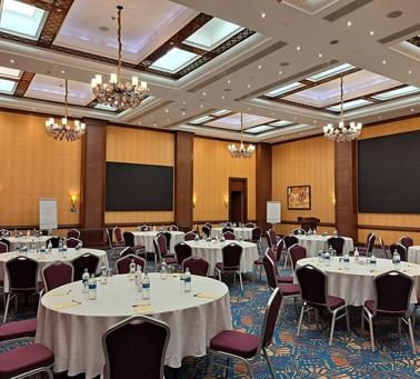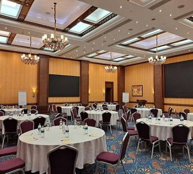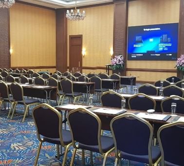 宴会厅套房 宴会厅位于酒店的一楼,并有自己的入口。它也可以被分割,以创建两个房间:阿拉曼达房间和素馨花房间。 阿曼尼室 私人的,大理石的入口大厅通向气势雄伟的阿曼尼房间,可容纳120名客人,还设有露天花园露台。此外,这间客房还设有演播室级的音响,灯光,视听效果,个人笔记本电脑工作站和免费无线网络连接。 芙蓉,美人蕉和马缨丹 作为会议中心的一部分,还有三个会议室,芙蓉,美人蕉和马缨丹,每个会议室可容纳30名代表,并设有一个独特的花园露台。